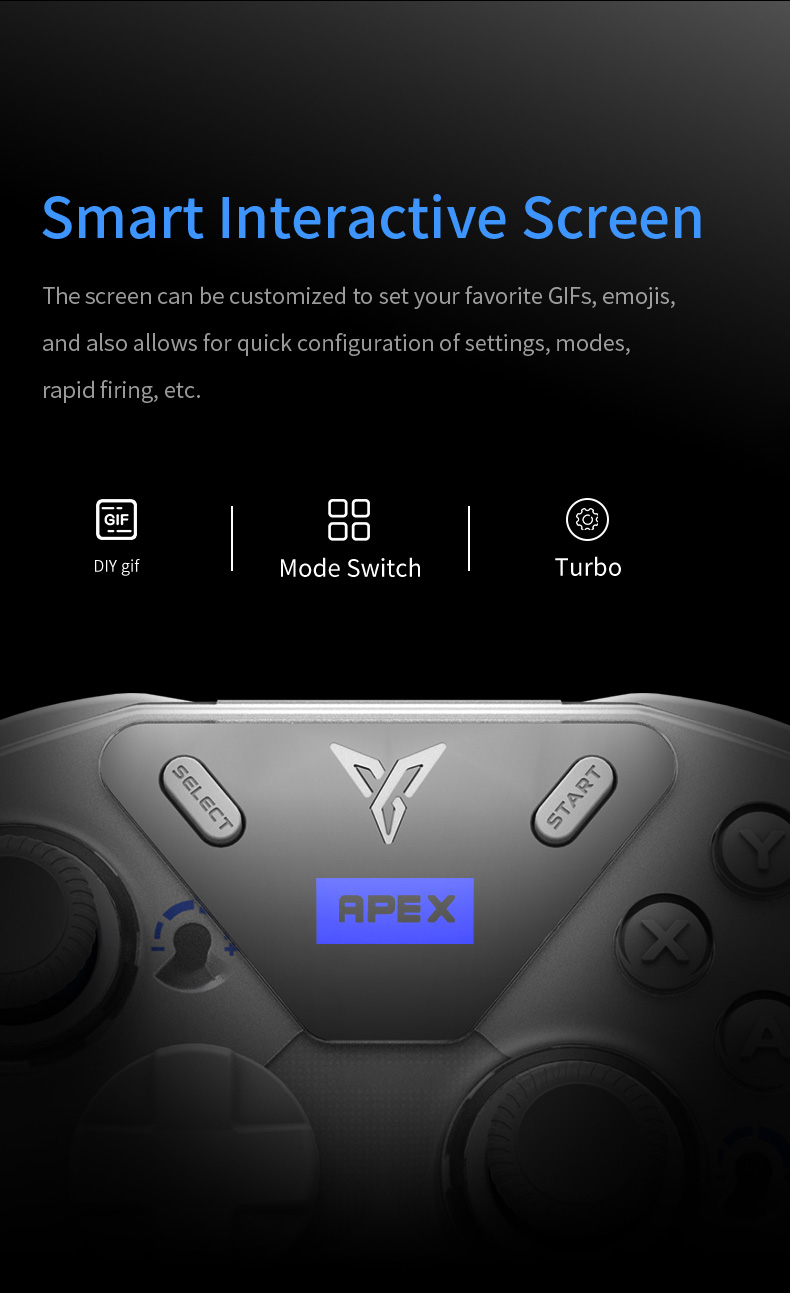 Täysvärinen interaktiivinen näyttö tuo visuaaliset asetukset suoraan gamepadiin: ei fyysisiä yhdistelmänäppäimiä eikä tarvetta PC-yhteydelle. Näytön animaatiot voi mukauttaa ja luoda oman ilmeen laitteelle.