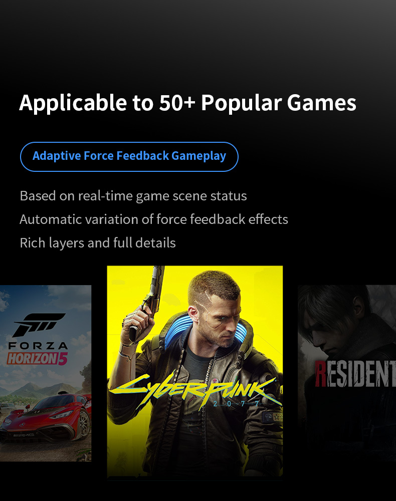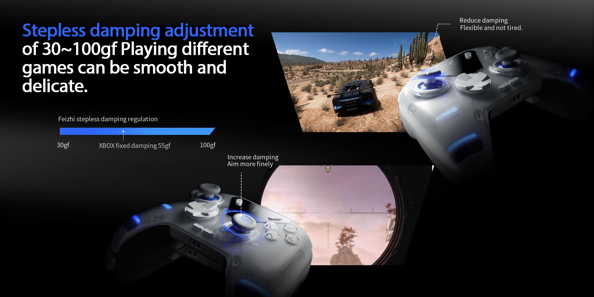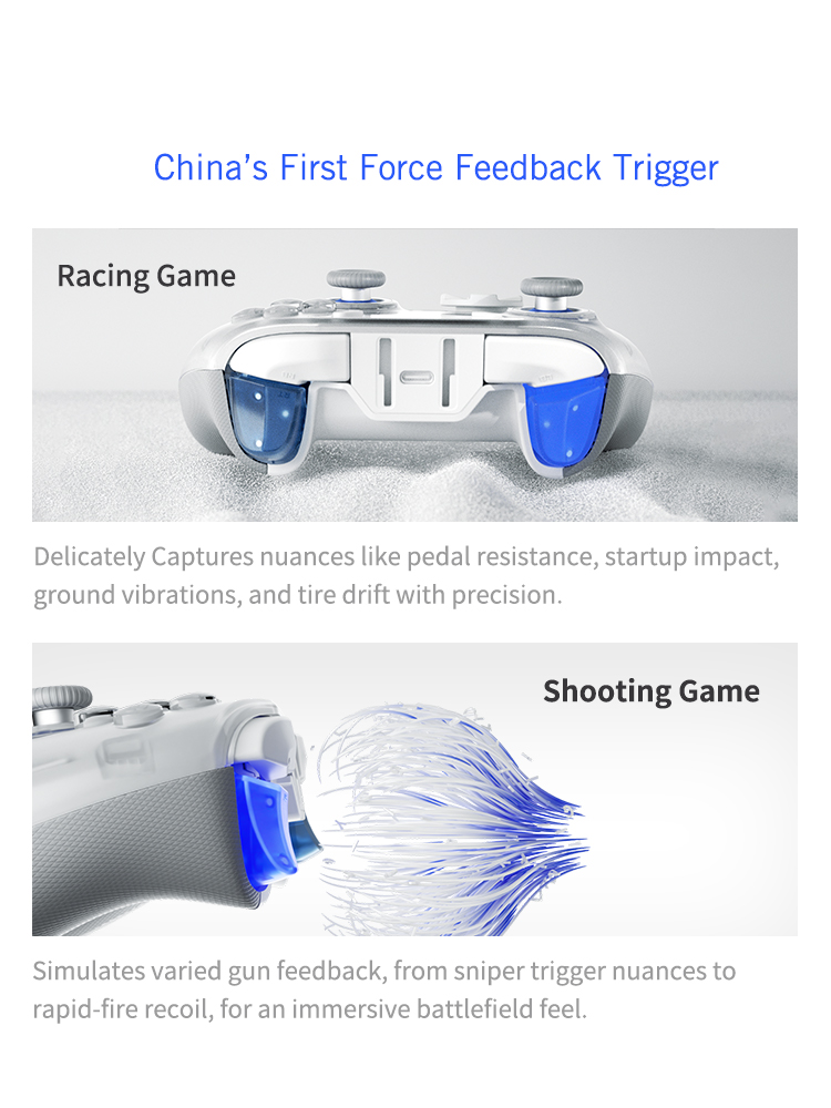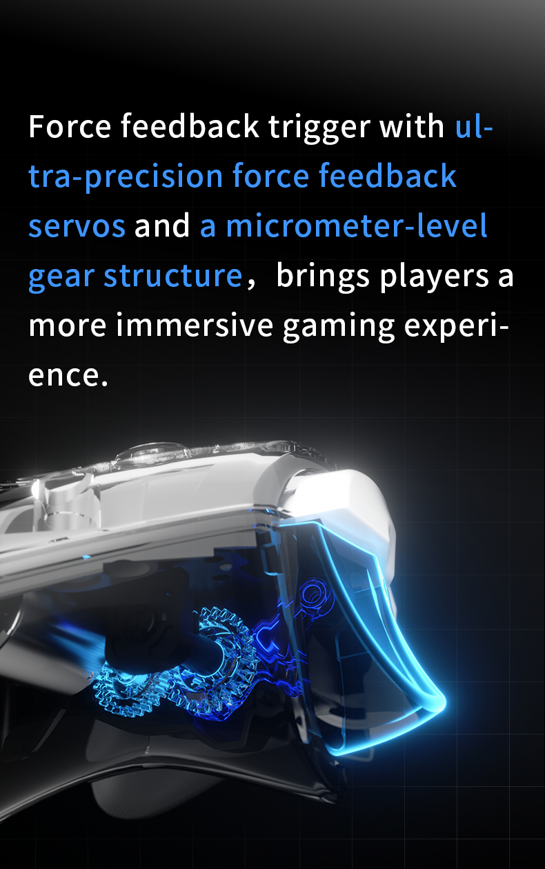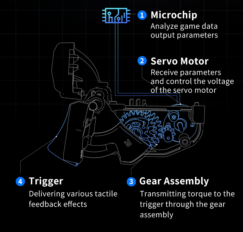 Voimapalautteiset liipaisimet mahdollistavat liipaisimen iskun, vaimennuksen ja värinän säädön. Hall-anturilla toteutettu liipaisin välittää pelin fyysisiä ominaisuuksia suoraan sormille, tuoden pelikokemuksen lähemmäs tapahtumia. Ohjelmiston hienosäädöt tuovat pelimaailman eläväksi.