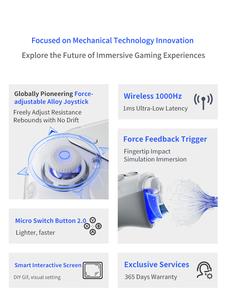 Epäsymmetrinen tärinämoottori luo erottuvan tuntopalautteen kummallekin kädelle. 1500mAh akku tarjoaa pitkän käyttöajan.