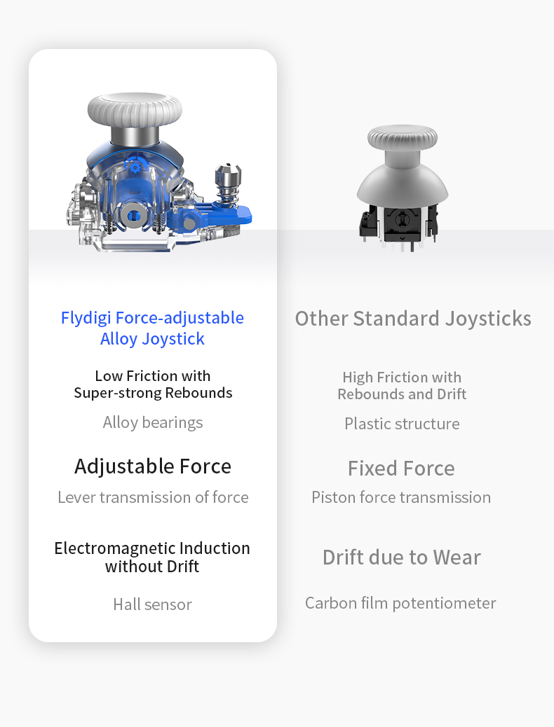 Kahdeksansuuntaisen “+”-suuntapainikkeen kääntöakseli hyödyntää FLYDIGI:n omaa akselitekniikkaa. Se rekisteröi suunnat herkästi ja antaa peukalolle tarkan palautteen, mikä helpottaa esimerkiksi taistelupelien komentojen hallintaa.