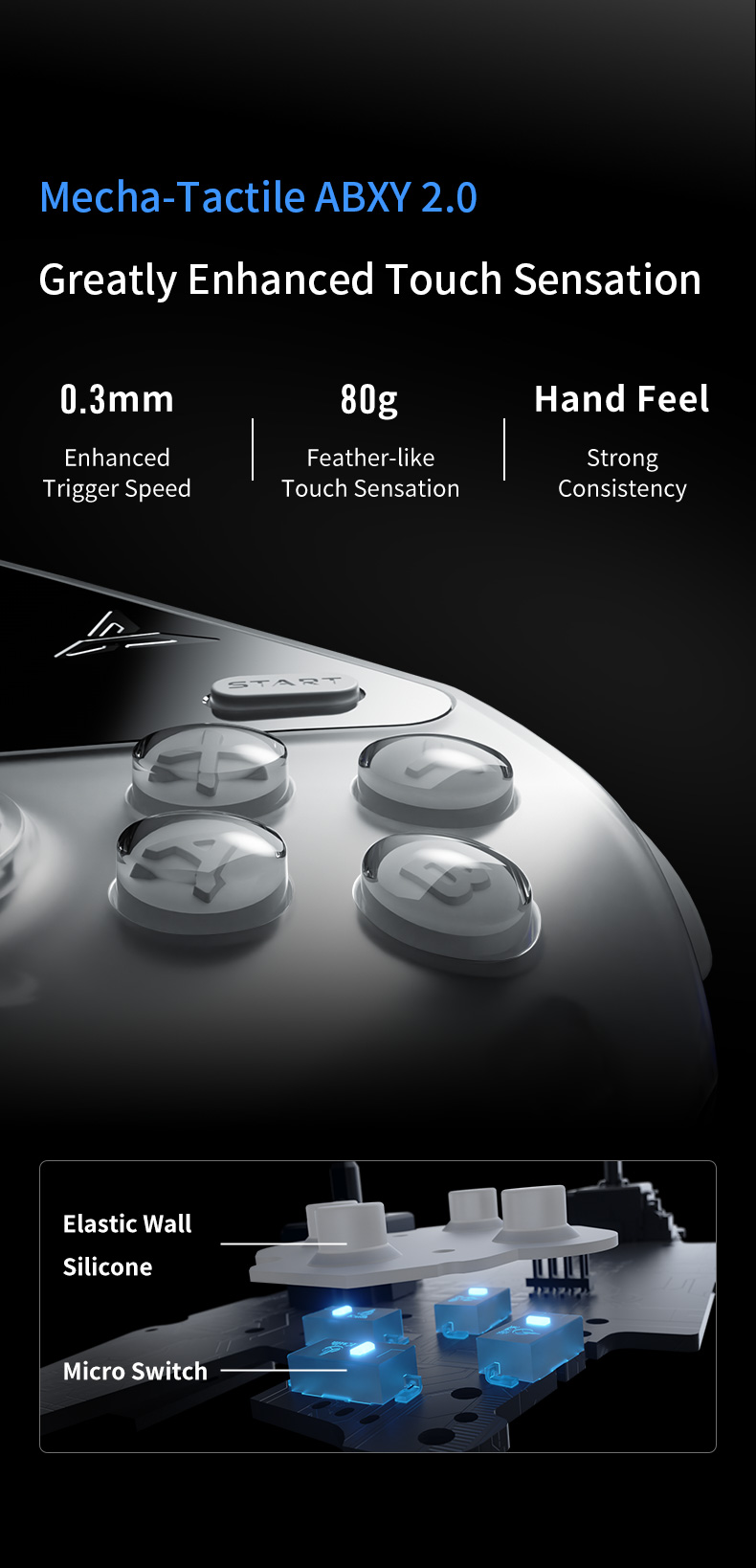 ABXY 2.0 -mekaaniset mikropainikkeet ovat herkät ja tuntumaltaan selkeät. ABXY-mikropainikkeiden liipaisimen liike on 0.3mm, mikä mahdollistaa nopean toiminnan, elastinen silikoniseinä varmistaa palautteen napin rebound-tuntumaan.