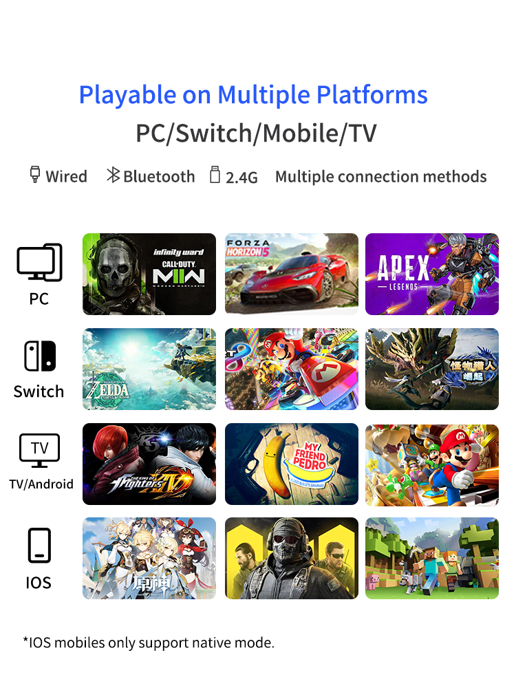 Monipuoliset liitännät: langallinen, Bluetooth ja 2.4G langaton. Yhteensopiva Nintendo Switchin, Steamin (tietokoneella), television ja tietokoneen kanssa.