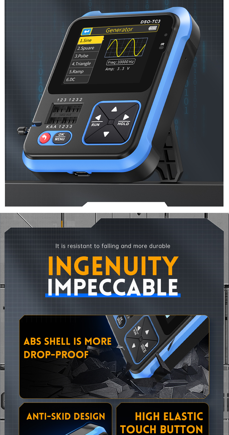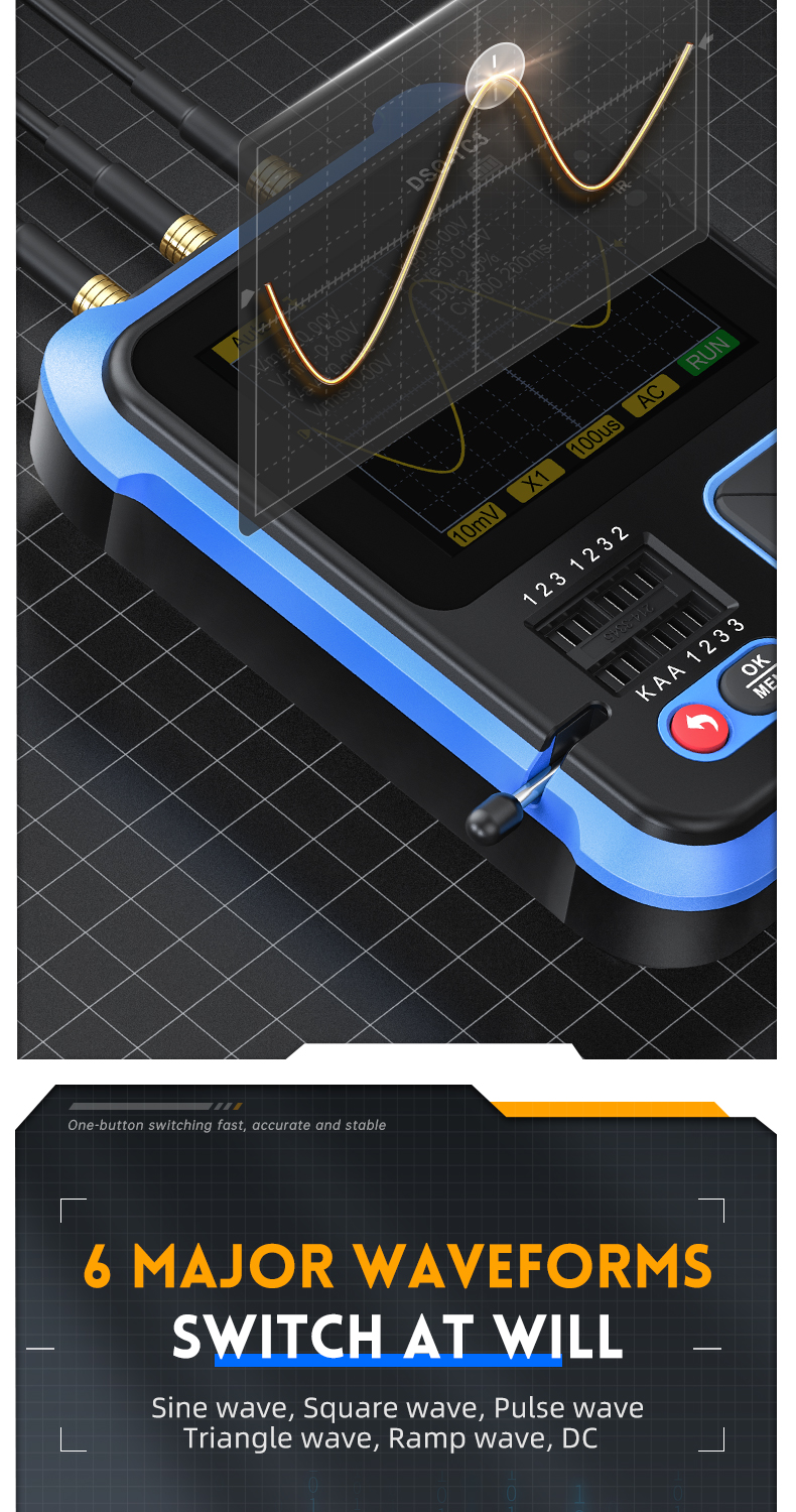 ● 3-in-1-toiminto: Yhdistää digitaalisen oskilloskoopin, transistoritesterin ja signaaligeneraattorin samaan laitteeseen. Sopii työpöydälle, huoltotöihin ja liikkuvaan käyttöön.