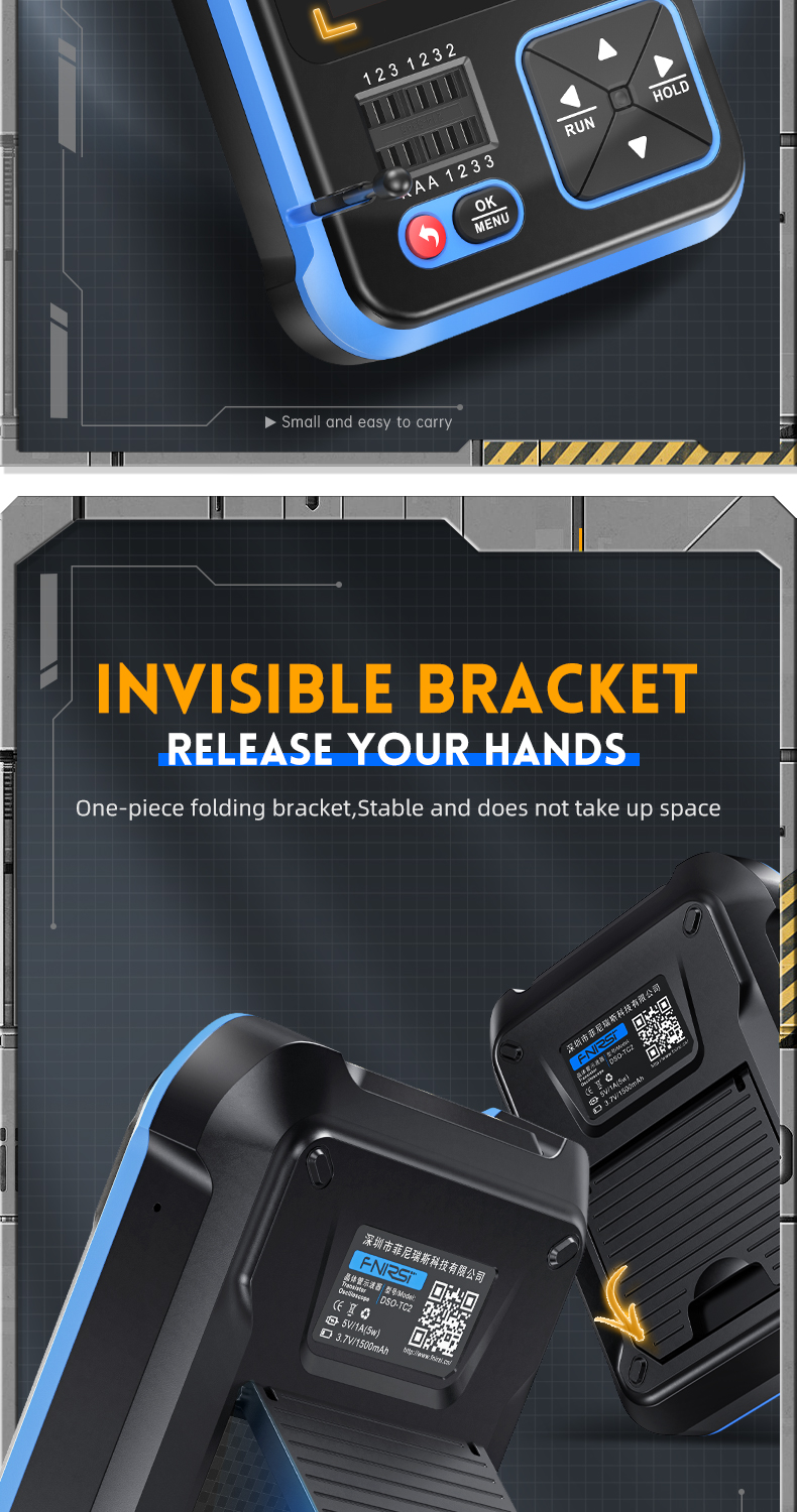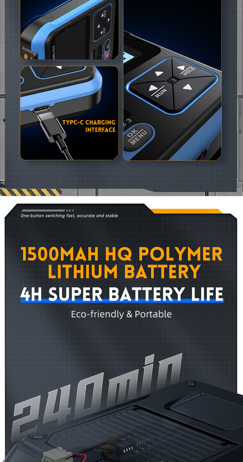 ● Pitkä käyttöaika: Sisäänrakennettu 1500mAh ladattava polymeeri-litiumakku. Lataus ja virransyöttö Type-C-liitännän kautta, jatkuva käyttö ilman erillistä erotusmuuntajaa.