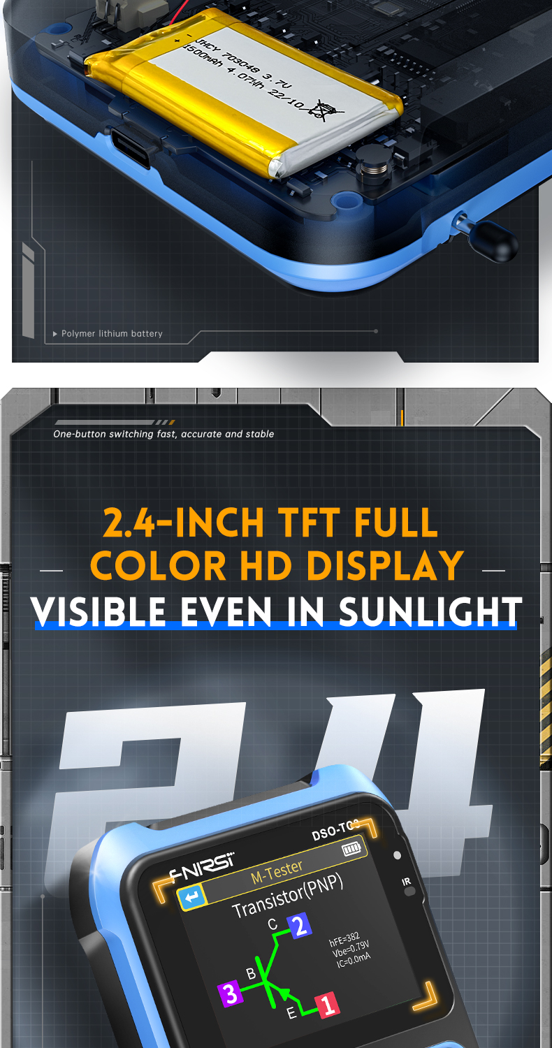 ● Transistoritesteri: Tunnistaa ja mittaa automaattisesti useita komponentteja, kuten NPN- ja PNP-transistorit, N- ja P-kanava-MOSFETit, JFETit, diodit, kaksoisdiodit, tyristorit sekä vastukset, induktanssit, kondensaattorit ja muut passiivikomponentit. Havaitsee automaattisesti nastojen järjestyksen.