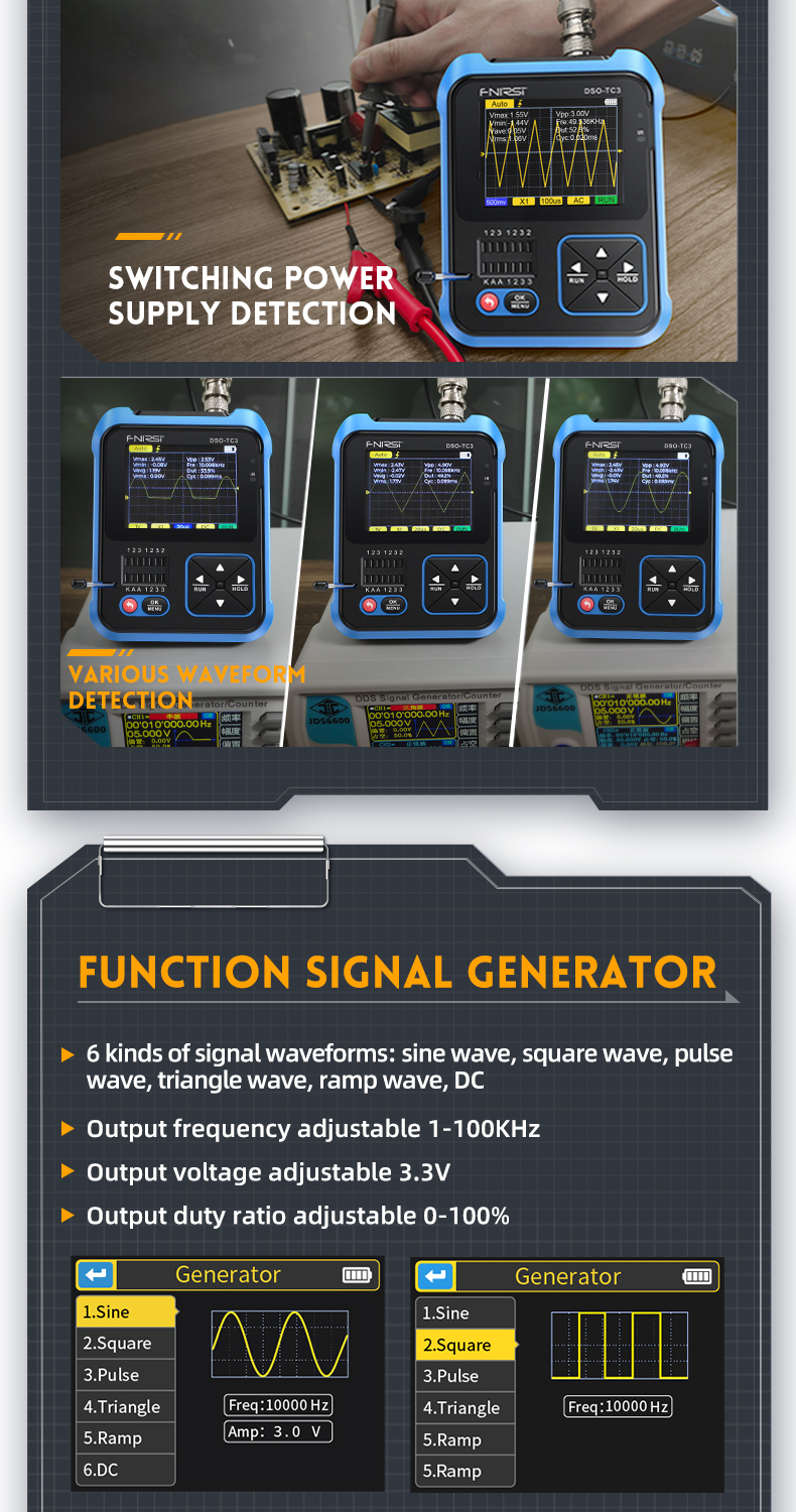 ● Signaaligeneraattori: 6 signaalimuotoa: sini, neliö, kantti, kolmio, sahalaita ja tasajännite. Taajuus säädettävissä välillä 1-100KHz, ulostulojännite 3.3V asti ja käyttöaste 0–100 % (mallikohtaisesti signaalimuodon mukaan, tarkemmat arvot taulukossa).