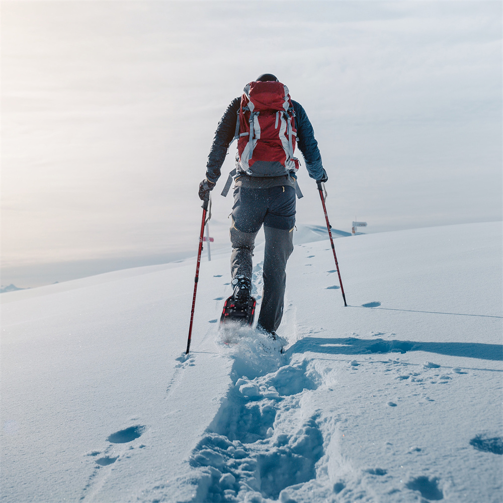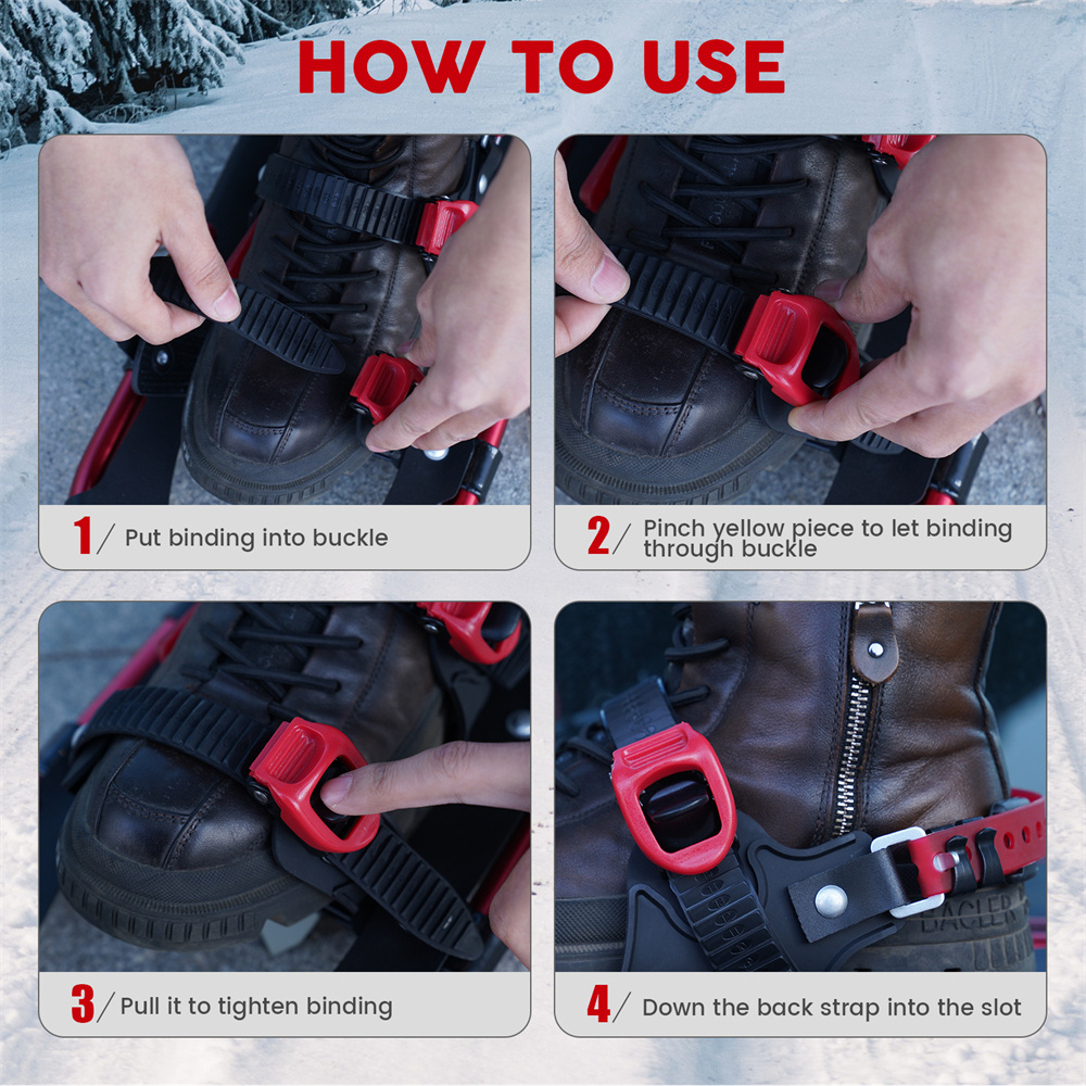 3. Kestävä materiaali: Lumikengissä on laadukas ja kevyt HDPE-kansi, joka lisää kantavuutta ja säästää energiaa. Terävät pitopiikit ovat korkealaatuista alumiinia, mikä parantaa pitoa lumella ja jäällä ja vähentää liukastumisriskiä.
