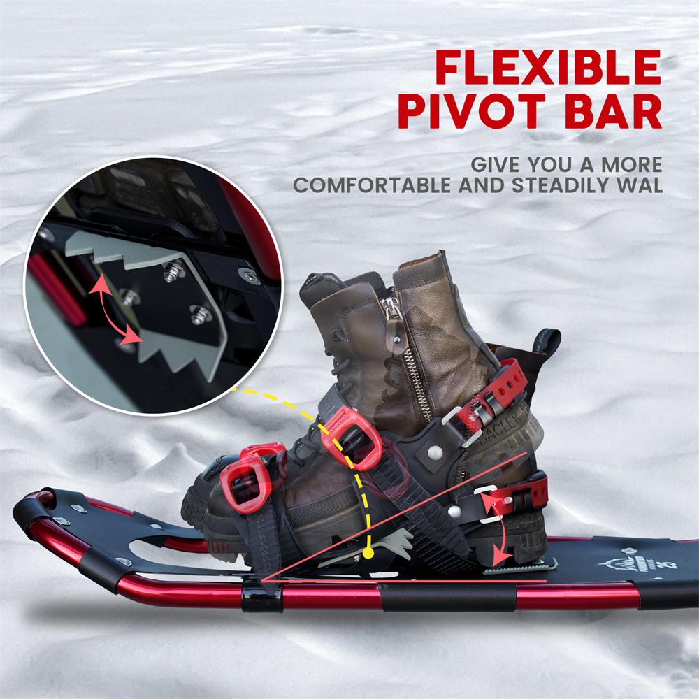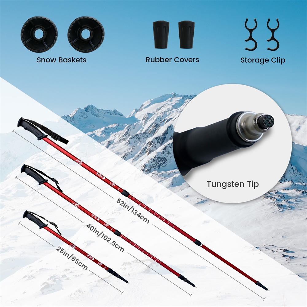 5. Säädettävät vaellussauvat: Teleskooppisauvojen pituuden säätäminen välillä 25–52 tuumaa on helppoa myös hanskat kädessä tai märissä olosuhteissa. Pakkaus sisältää parin lumikenkäsauvoja, parin lumikenkää sekä kantolaukun.