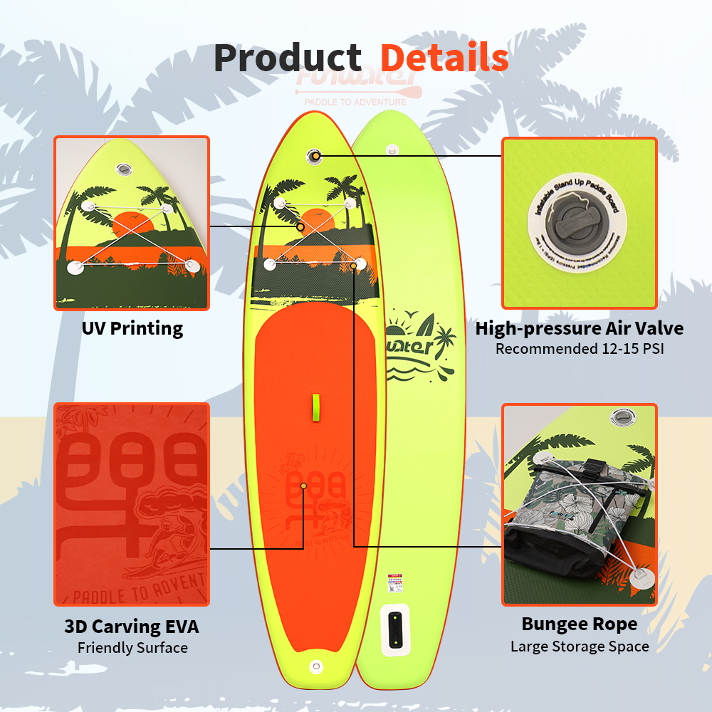 - Vakaa ja tilava: ilmatäytettävän SUP-laudan mitat on esitetty kuvissa. Laaja pinta tekee laudasta tukevan, mutta se on silti kevyt, vain 13KG. Suositeltu turvallinen paine on 12-15PSI ja enimmäiskantavuus jopa 420 lbs. Sopii aloittelijoille, kokeneille melojille, aalloilla melontaan sekä lapsille ja nuorille.