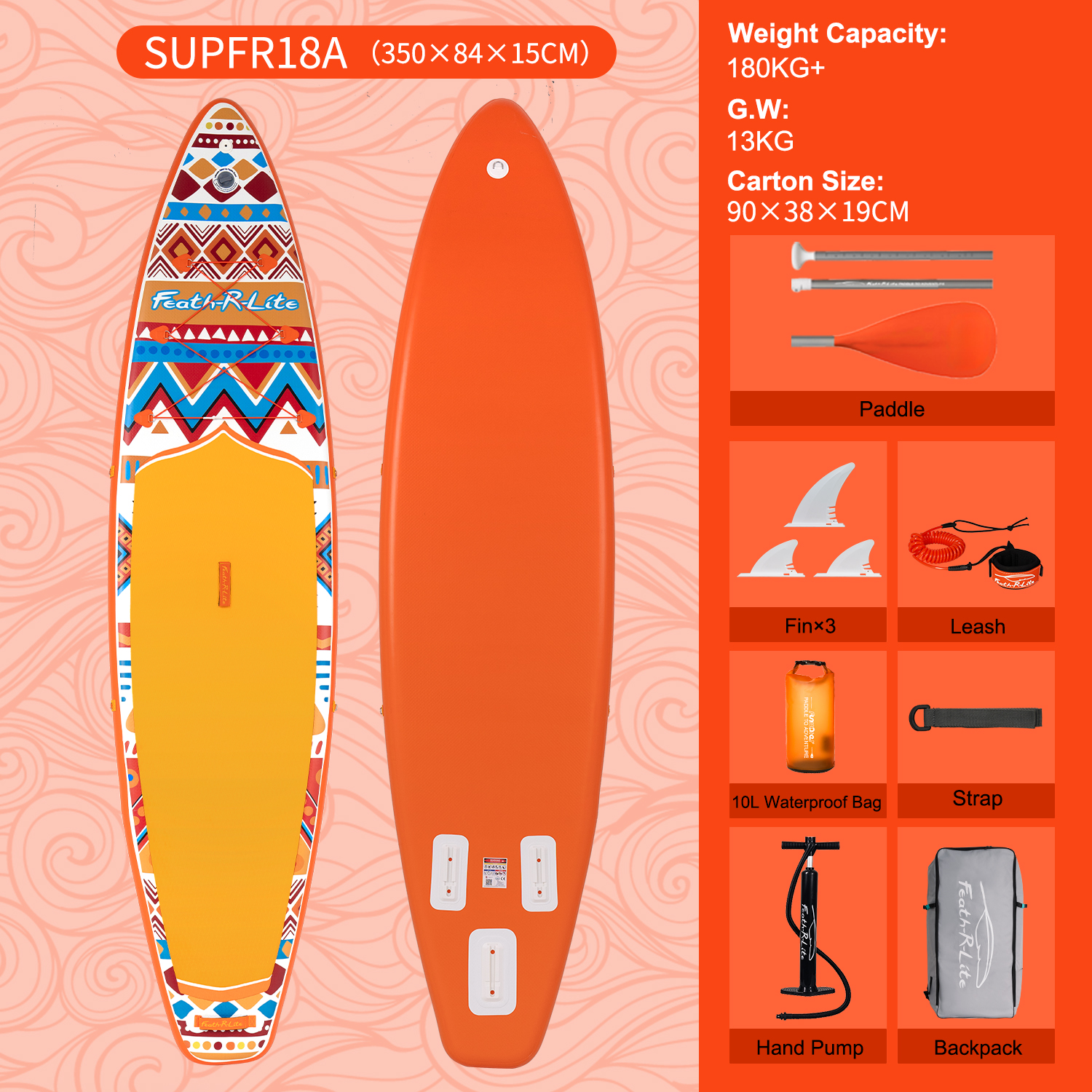 Funwater puhallettava SUP-lauta 350*84*15cm oranssi maksimikuorma 180kg mukana mela pumppu reppu