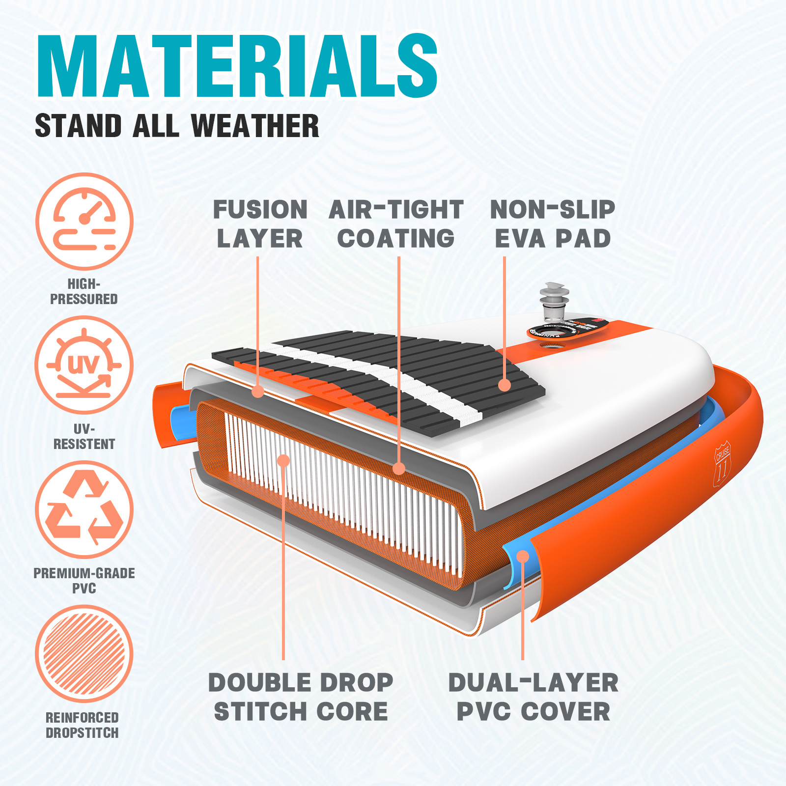 4. Sisäosassa käytetään ensiluokkaista vetolujuutta kestävää ilmatyynymateriaalia, jonka vetolujuus on 120N ja suurin suositeltu ilmanpaine 18PSI.