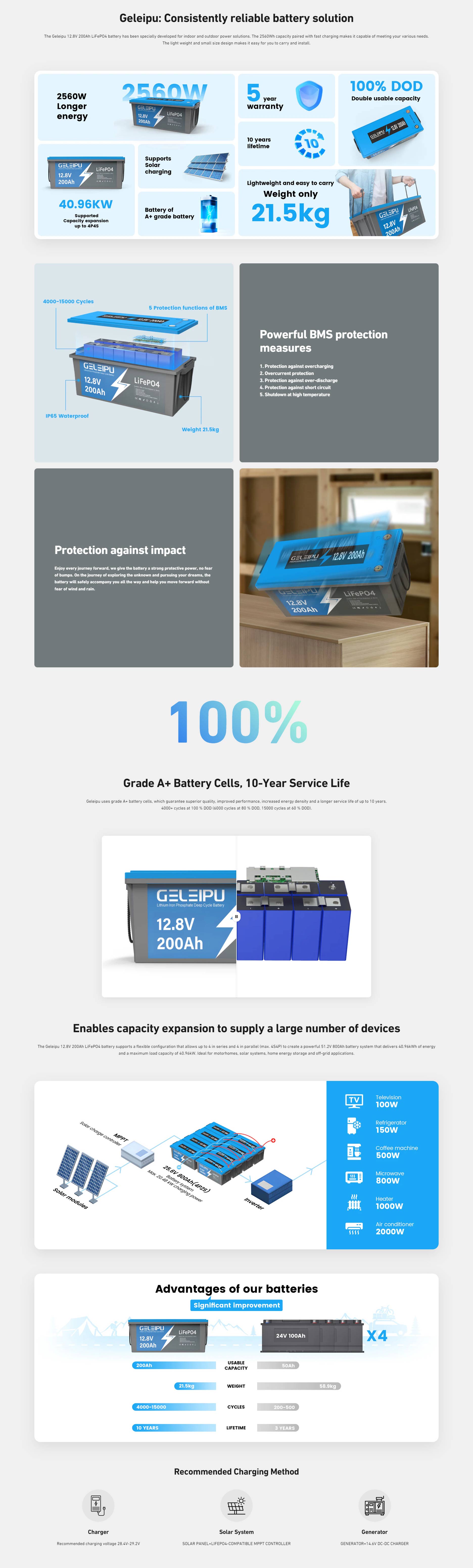 Geleipu 12.8V 200Ah LiFePO4 -akku soveltuu erityisesti aurinkosähköenergian varastointiin, 30–70lbs työntövoiman sähköperämoottoreihin, matkailuautojen varavirta-akuksi, off-grid-järjestelmiin sekä kotitalouksien akkupaketteihin.