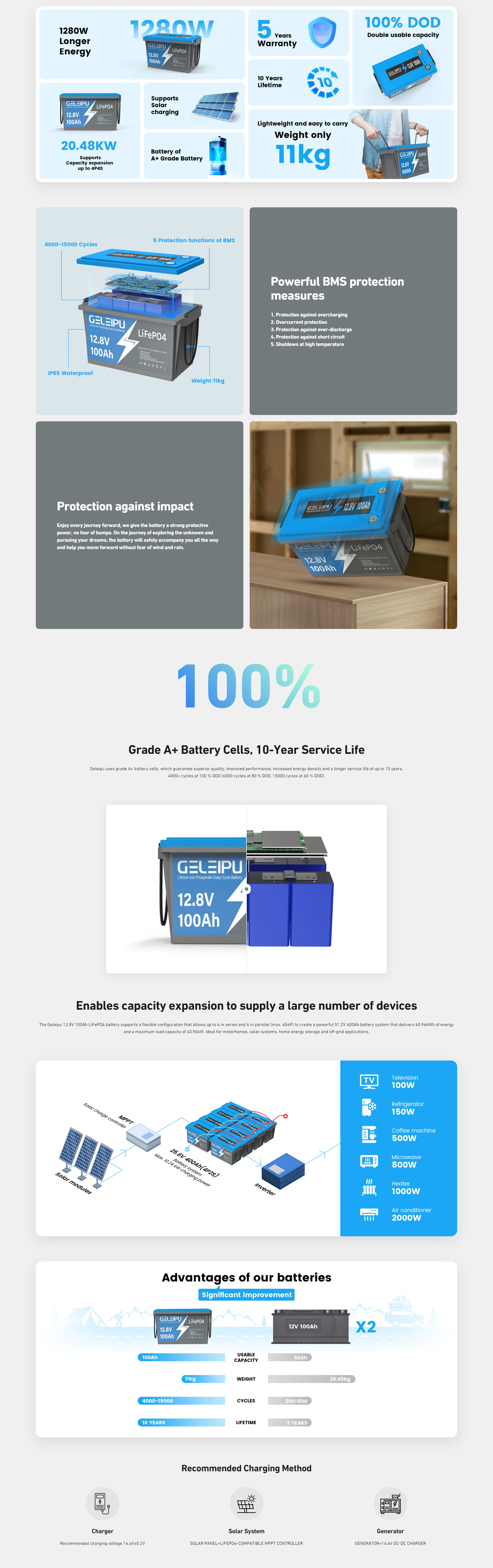 Geleipu 12.8V 100Ah -akku tukee jopa 4P4S-kytkentää, jolloin kokonaisenergiaksi saadaan enintään 20.48kWh (20.48kW) ja kuormatehoksi enintään 20.48kW. Tämä mahdollistaa käytön laajemmissa energiavarastointijärjestelmissä.