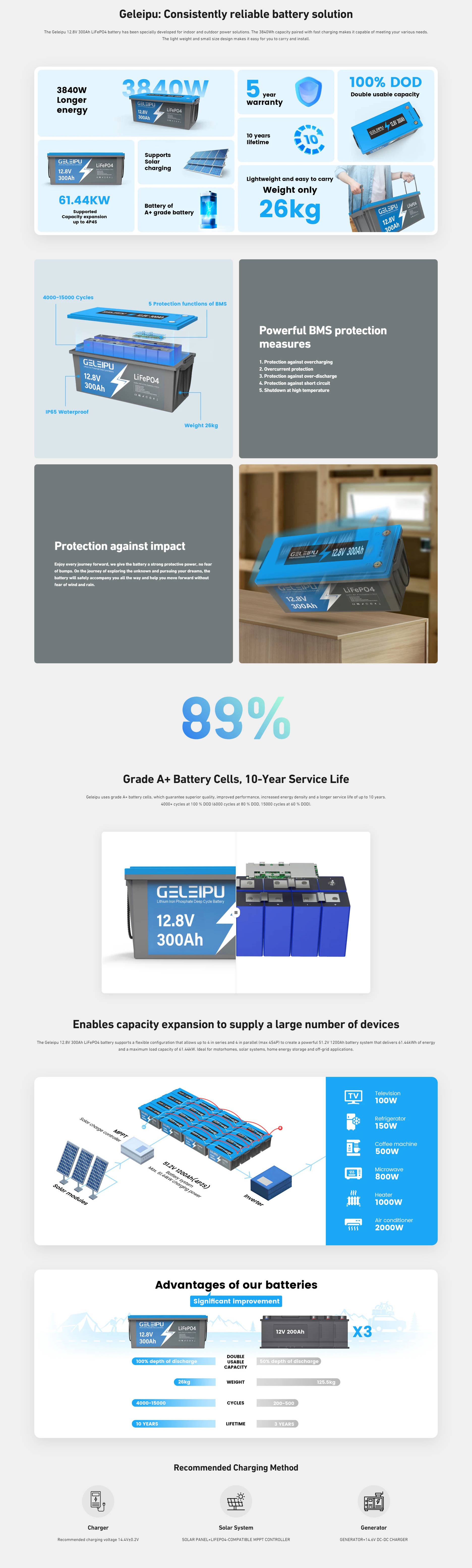 1 kpl Geleipu 12.8V LiFePO4 300Ah -akku tarjoaa enintään 3840Wh kapasiteetin. Geleipu 12V LiFePO4 -akku tukee 100% DOD-käyttöä (4000+ sykliä @ 100% DOD, 6000+ sykliä @ 80% DOD, 15000+ sykliä @ 60% DOD), kun taas AGM-akkuja suositellaan käytettäväksi vain noin 50% DOD-tasolla.