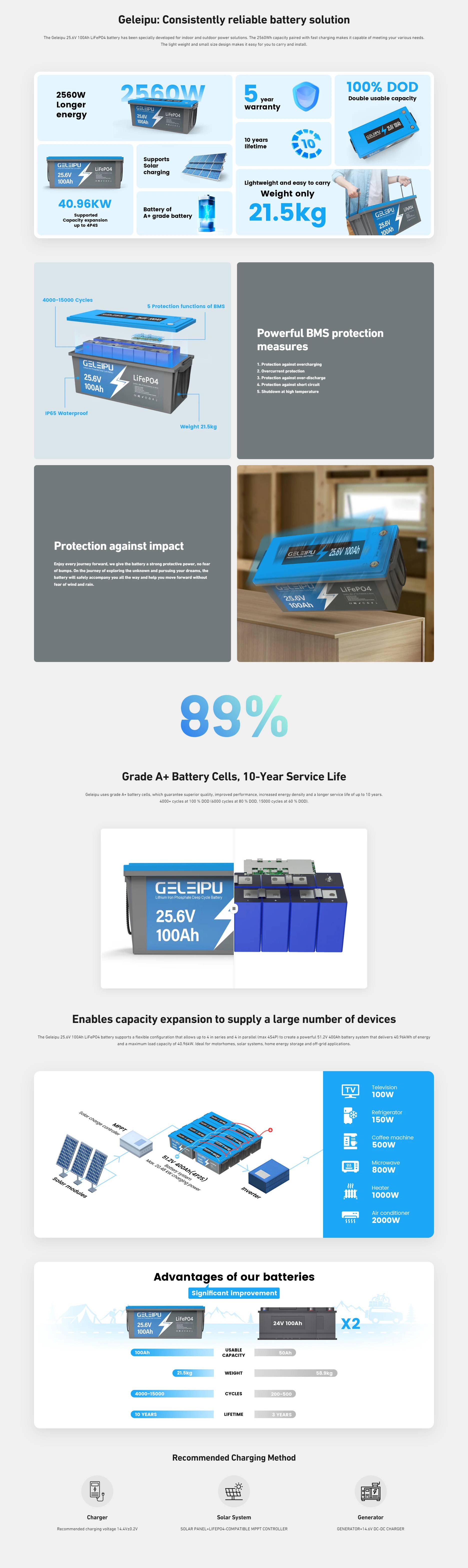 Geleipu 25.6V 100Ah -akku tukee enintään 4P4S-kytkentää, jolloin kokonaisenergiaksi saadaan jopa 40.96kWh (40.96kW) ja suurin kuormitusteho 40.96kW. Tämän ansiosta akku sopii laajasti erilaisiin energia- ja varavoimaratkaisuihin.