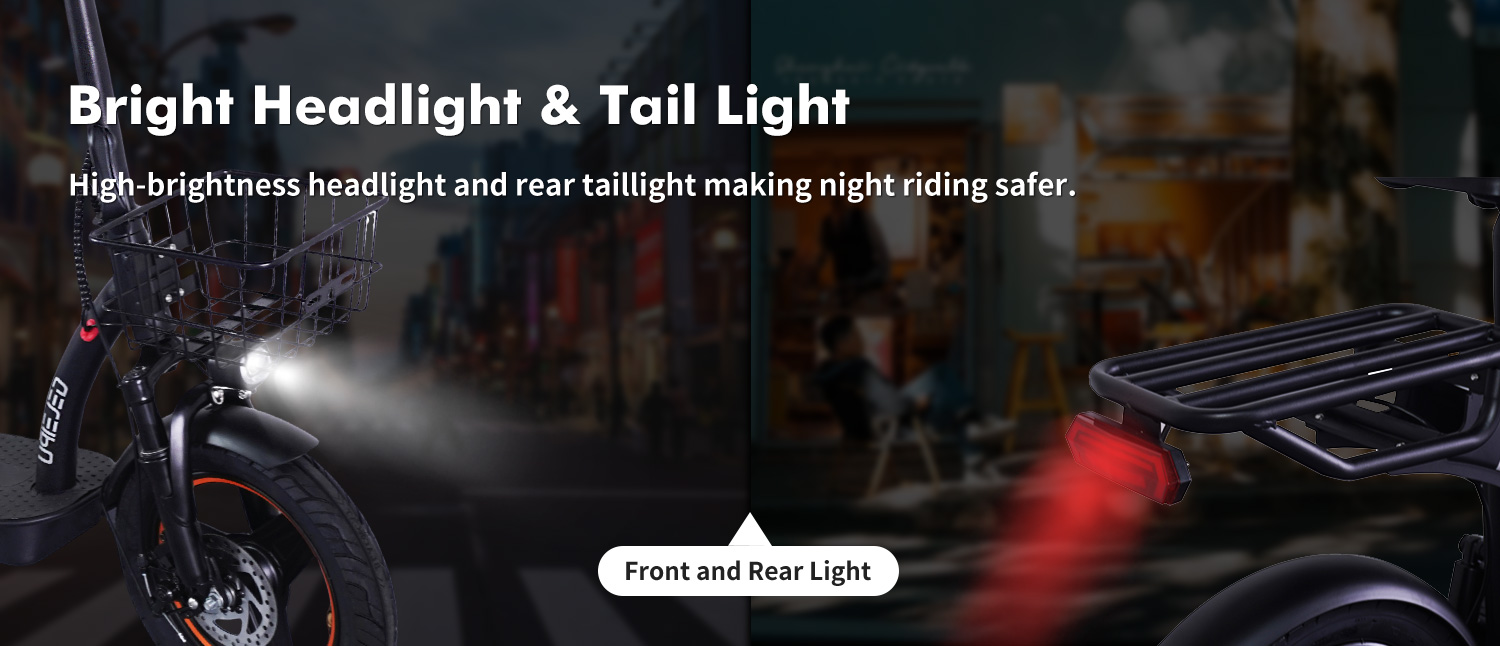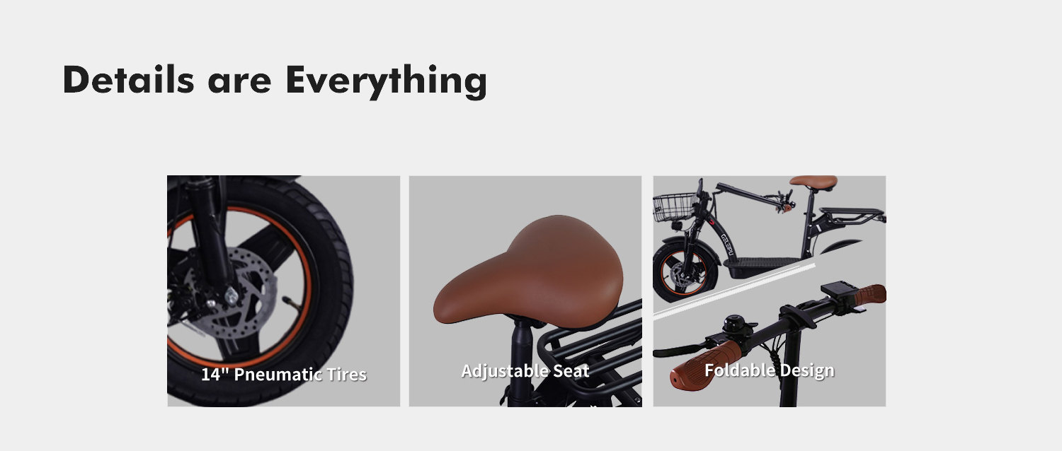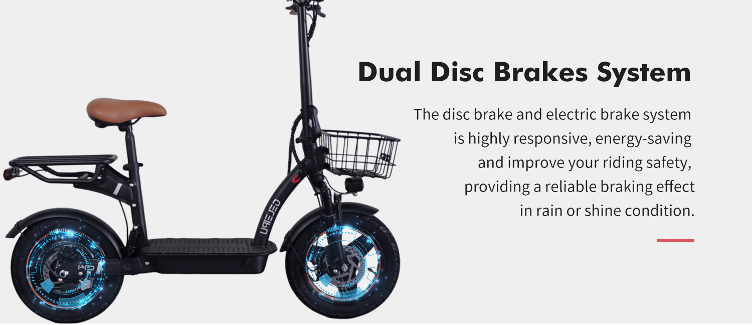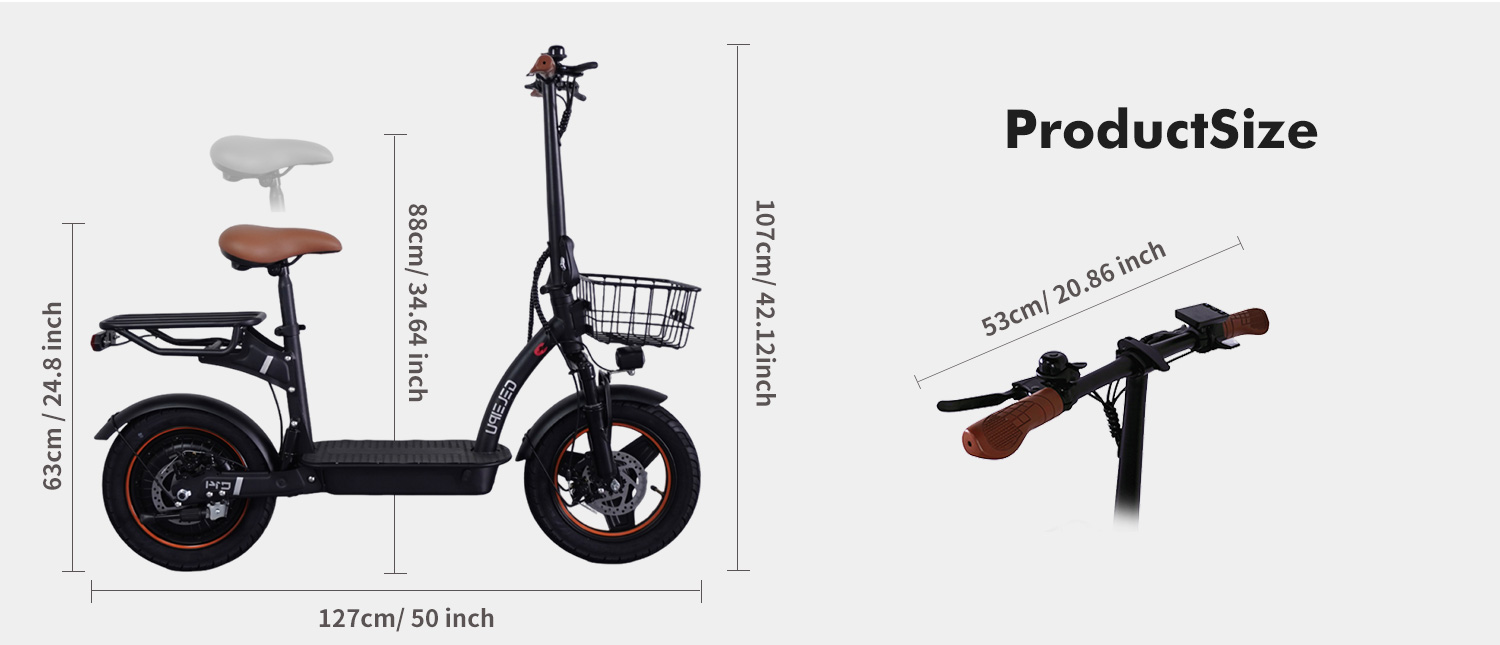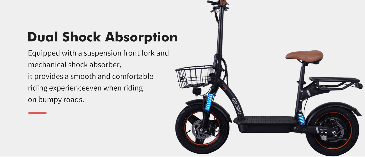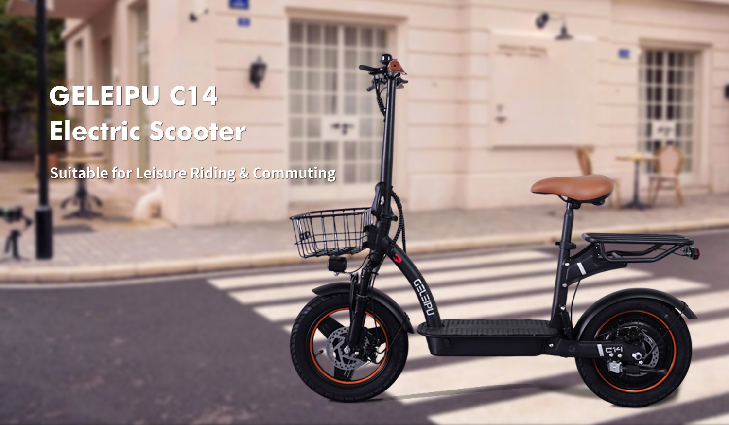 GELEIPU C14 on kokoontaitettava sähköskootteri, jossa on istuin, etukori ja tavarateline arjen kulkemista varten. Tehokas 500W-moottori, pitkä 100KM toimintasäde ja 48V 17.5Ah akku tekevät siitä sopivan sekä työmatkoihin että vapaa-ajan ajoon.