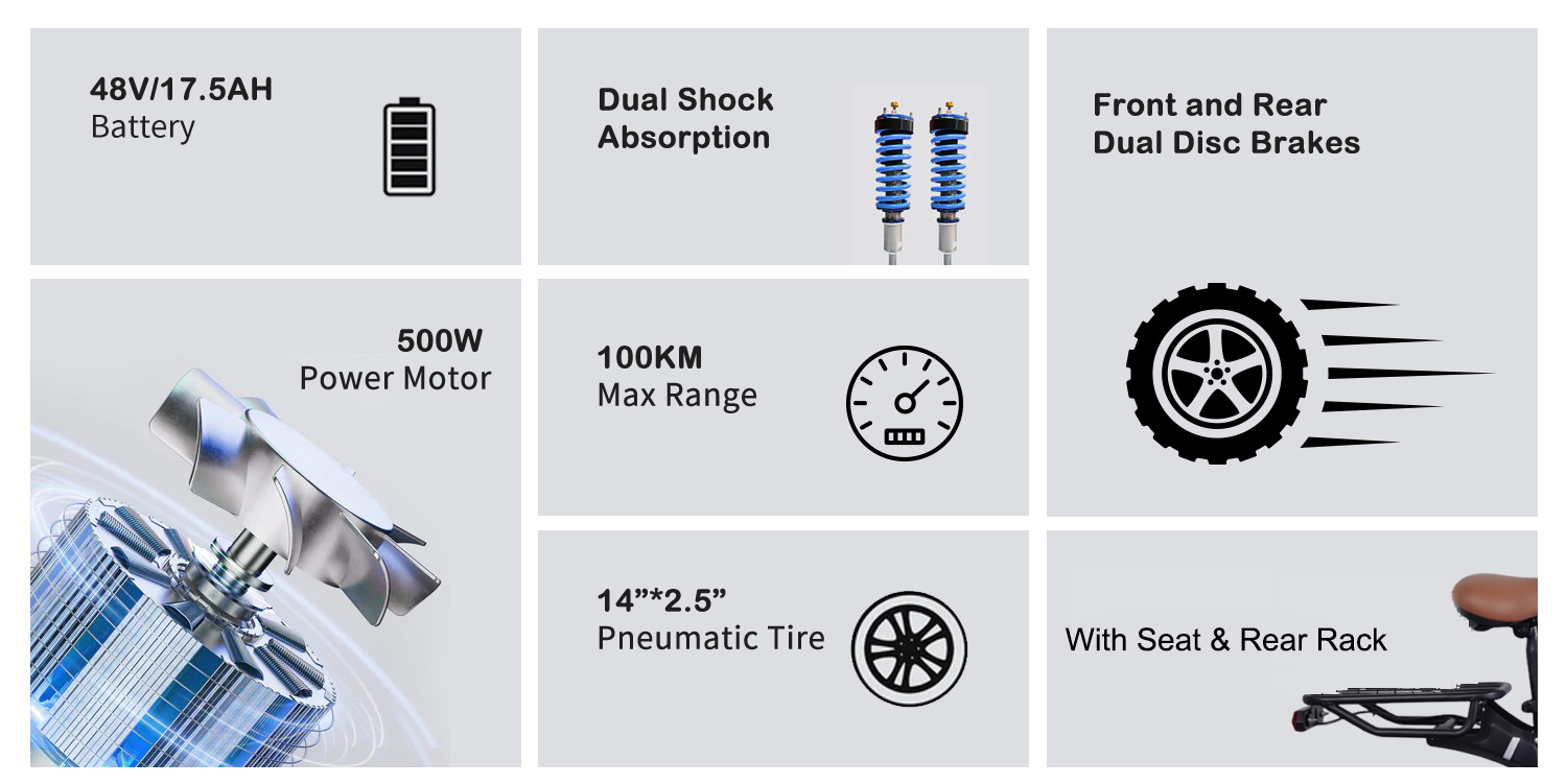 - 14*2.5-tuumaiset ilmakumirenkaat ja kaksinkertainen iskunvaimennus mukavaan ajoon