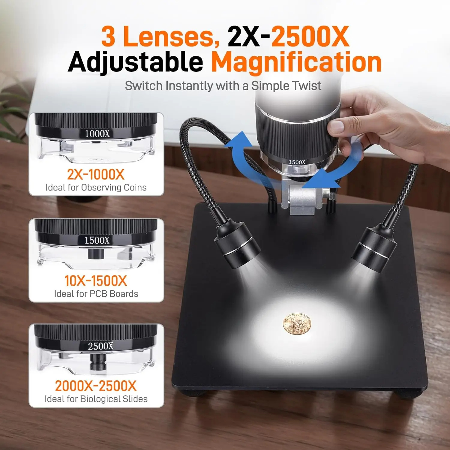 1. Monipuolinen suurennus: Vaihda helposti 1000X-, 1500X- ja 2500X-objektiivien välillä eri käyttötarkoituksiin, kuten kolikoiden tutkimiseen, tarkkaan PCB-juottamisen tarkasteluun ja yksityiskohtaiseen biologisten näytepreparaatioiden analyysiin.