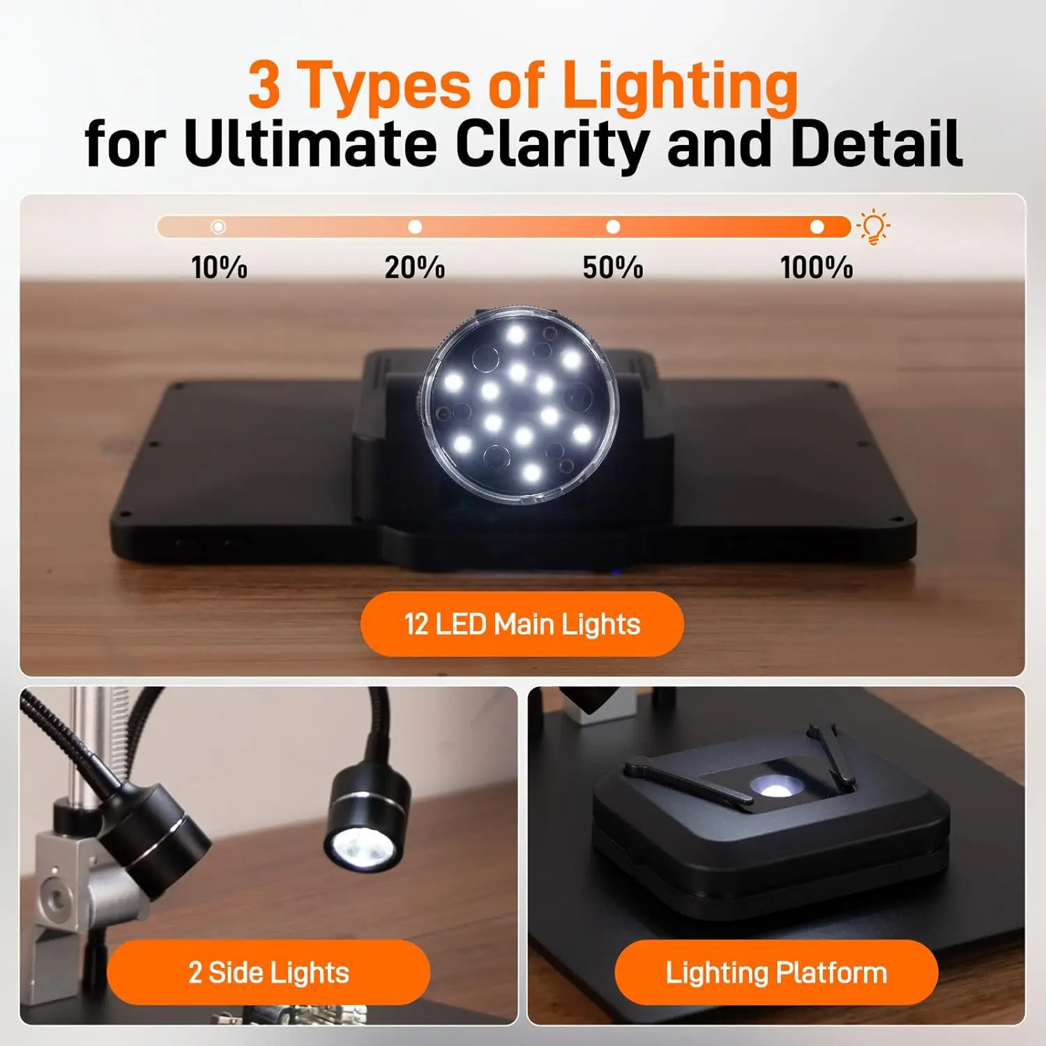 3. Edistynyt valaistusjärjestelmä: Varustettu 12 säädettävällä sisäisellä LED-päävalolla, 2 joustavalla hanhenkaulisivuvalolla ja pohjavalolla näytepreparaatteja varten. Näin saat sopivan valaistuksen yksityiskohtien tarkasteluun myös hämärissä olosuhteissa.
