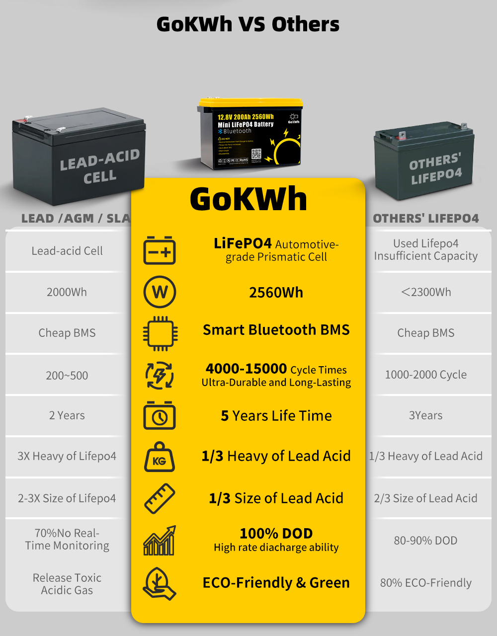 Gokwh 12V 200Ah LiFePO4 2560Wh LCD-näytöllä energiavarastolaatikko matkailuautoon veneeseen kotiin