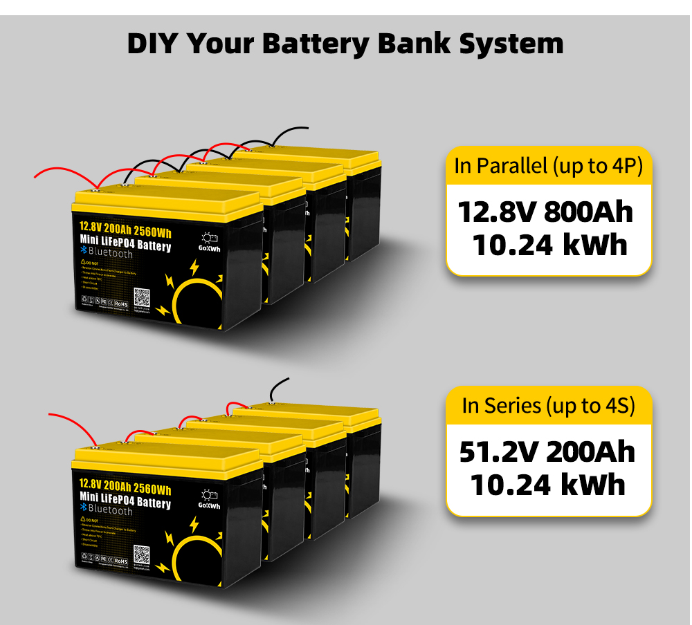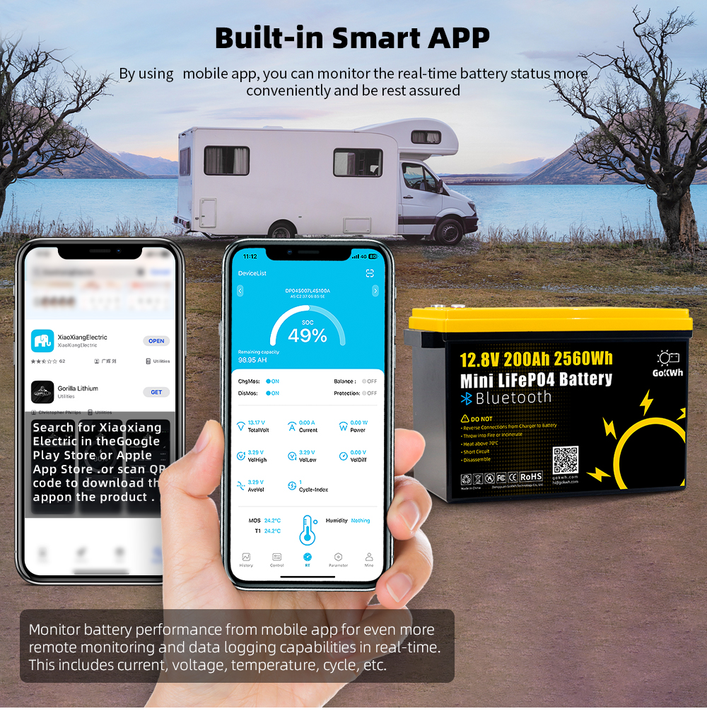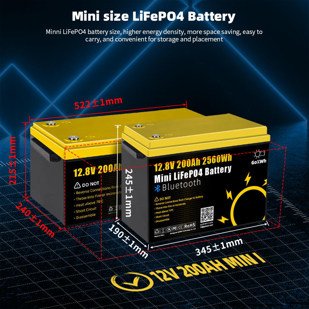 Gokwh 12,8 V 200 Ah minikokoinen LiFePO4-akku sisäänrakennetulla Bluetooth-BMS:llä IP65-suojattu