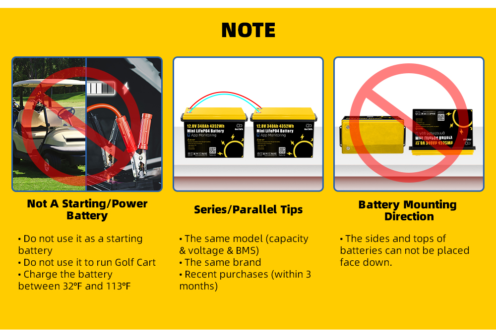 ⚠️ Huomautus: Vain identtisiä akkuja (sama malli, sama tuotemerkki ja ostettu 3 kuukauden sisällä) saa kytkeä sarjaan tai rinnan. Sarja- ja rinnankytkentää ei saa yhdistää keskenään.