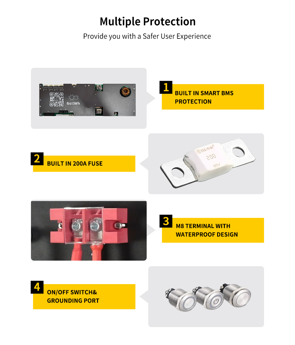 - Helppo seuranta ja suojaus: Bluetooth ja sovellustuki mahdollistavat kunnon ja suorituskyvyn seurannan. Monipuoliset suojaukset ja 200A sulake lisäävät turvallisuutta ylilatausta ja oikosulkuja vastaan.