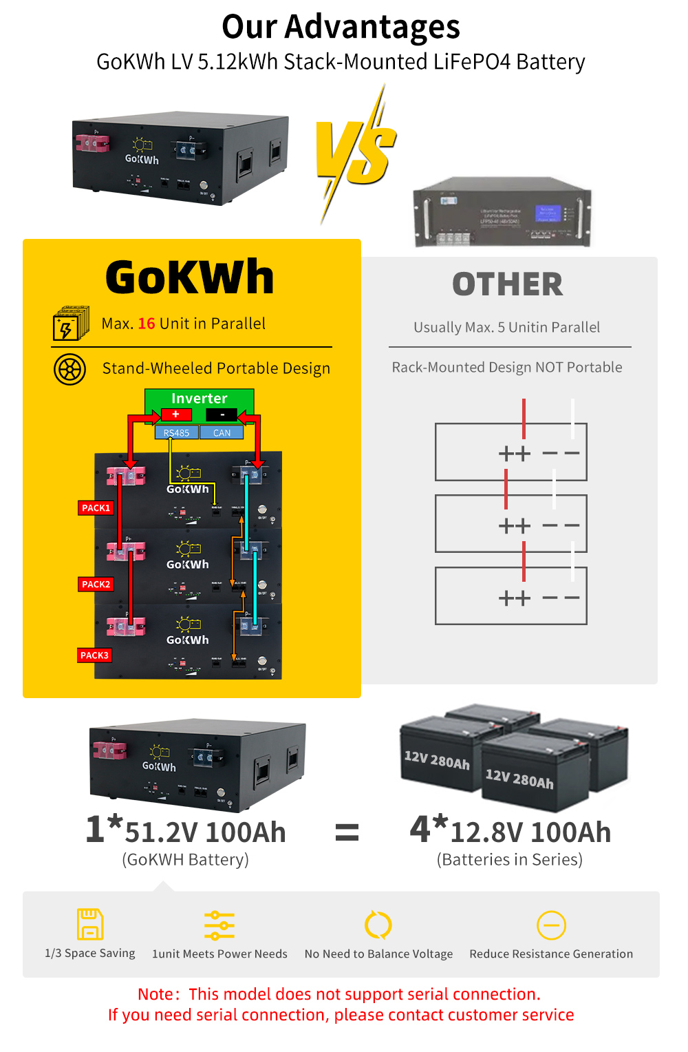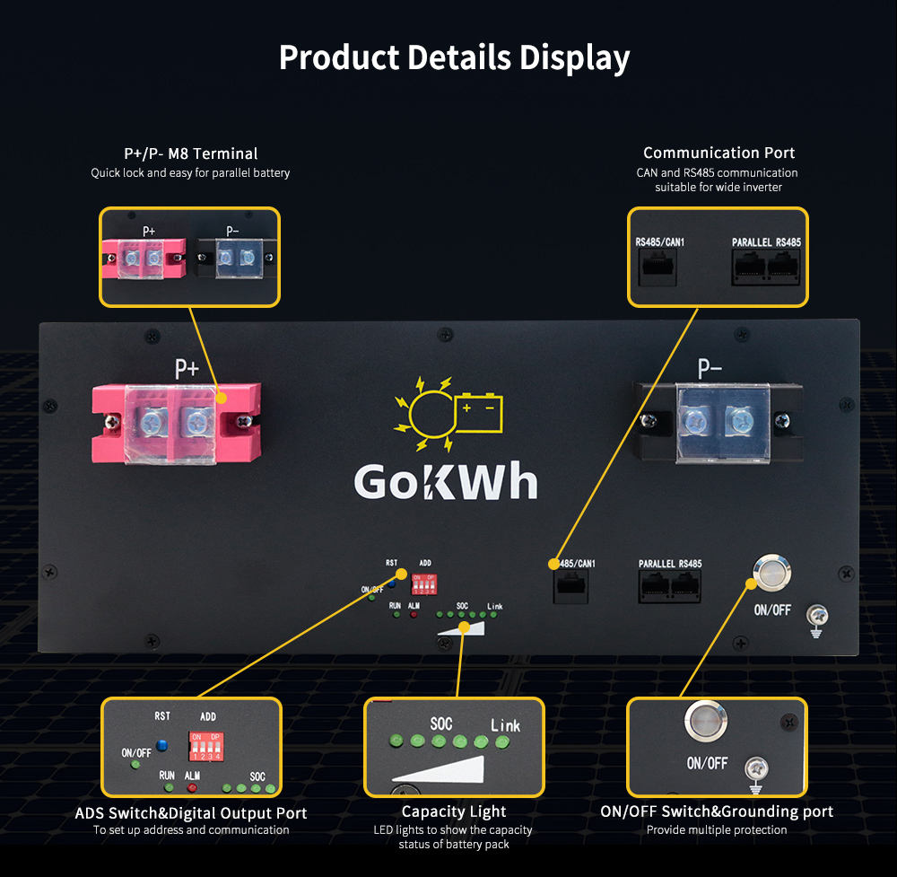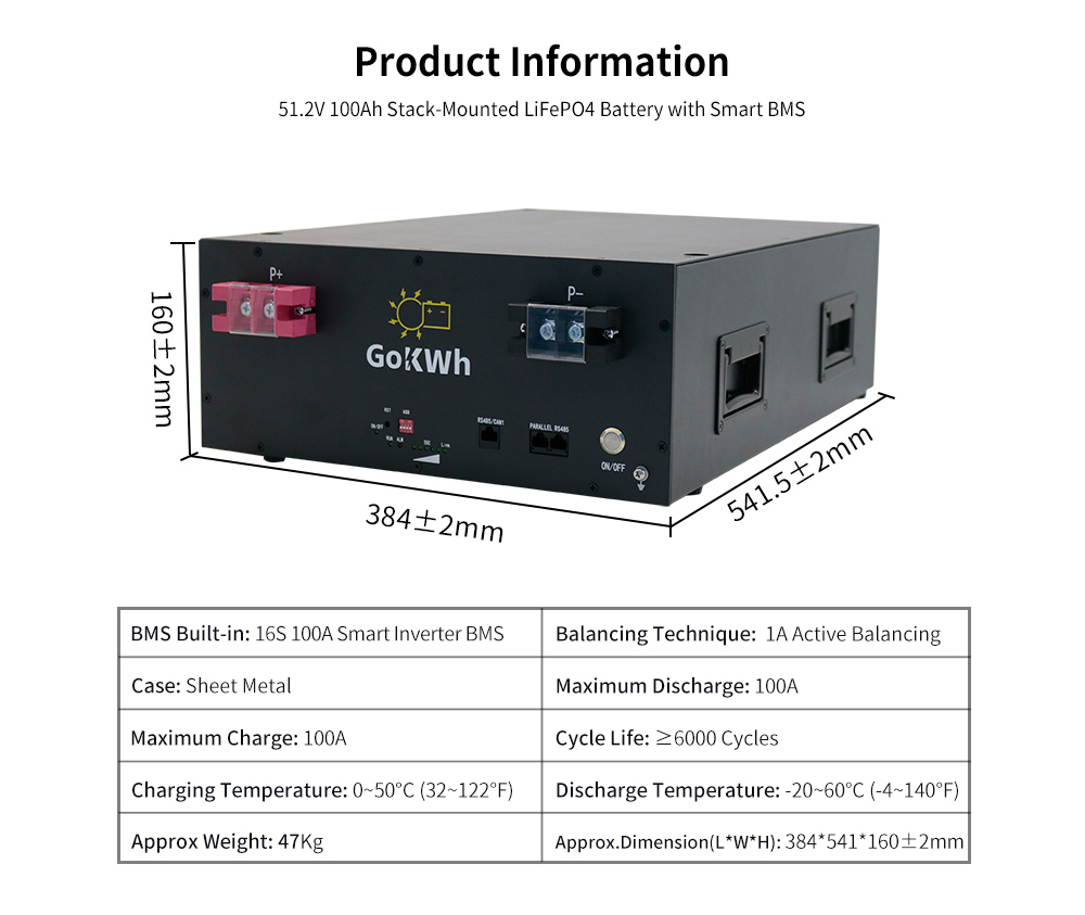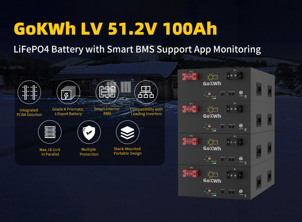 Gokwh Energy Storage Box on 51.2V LiFePO4-energiavarasto, joka tarjoaa suuren kapasiteetin ja pitkän käyttöiän koti- ja aurinkosähköjärjestelmiin. Sisäänrakennettu älykäs invertteri-BMS parantaa turvallisuutta ja mahdollistaa helpon seurannan Bluetoothin ja sovelluksen kautta.