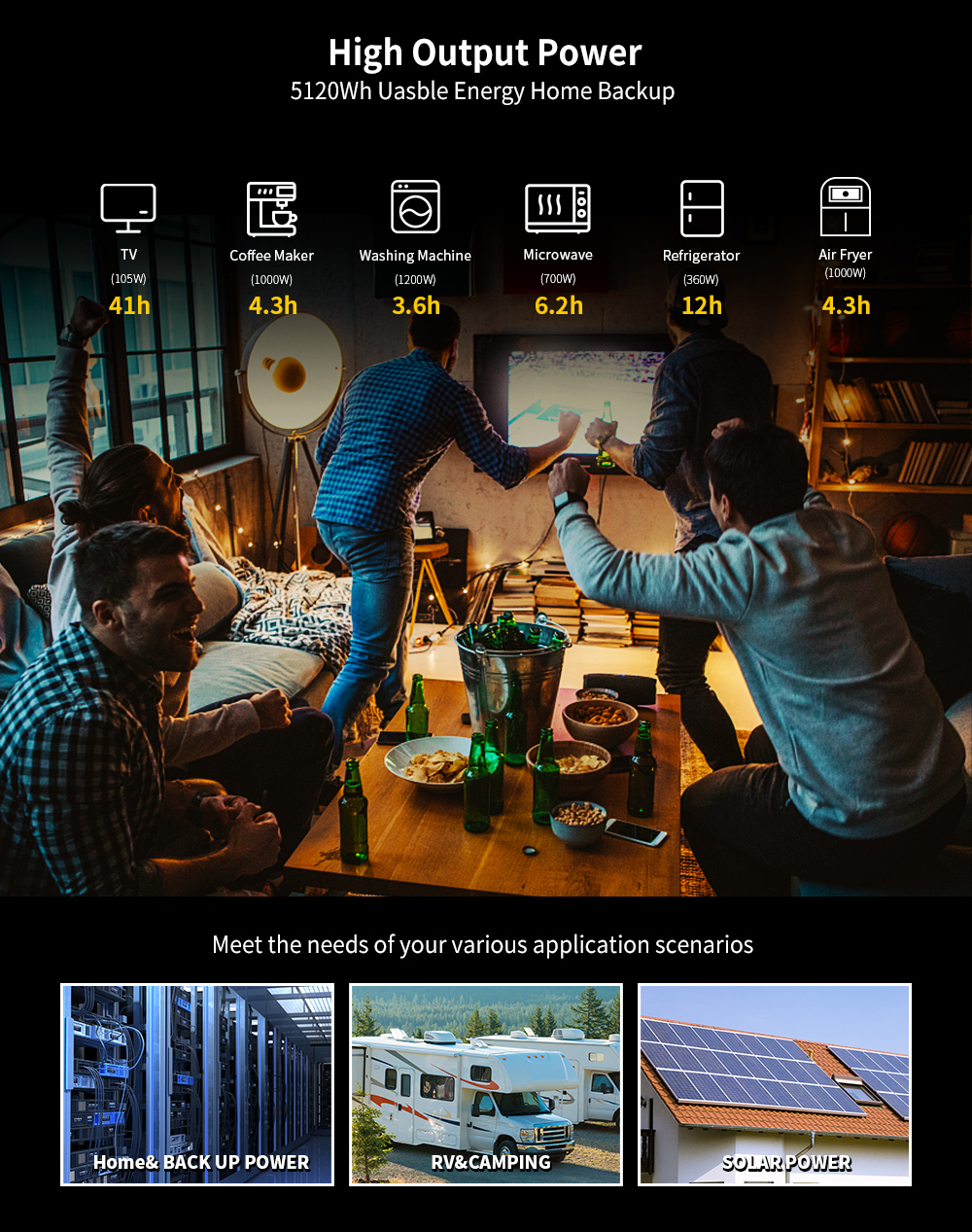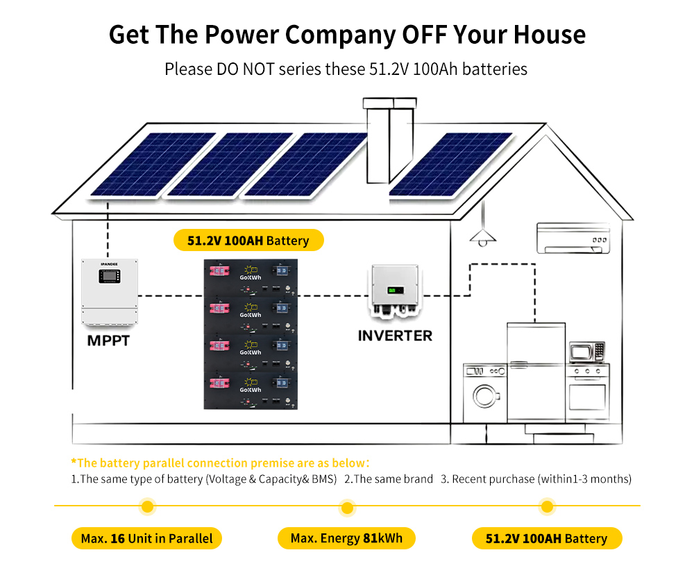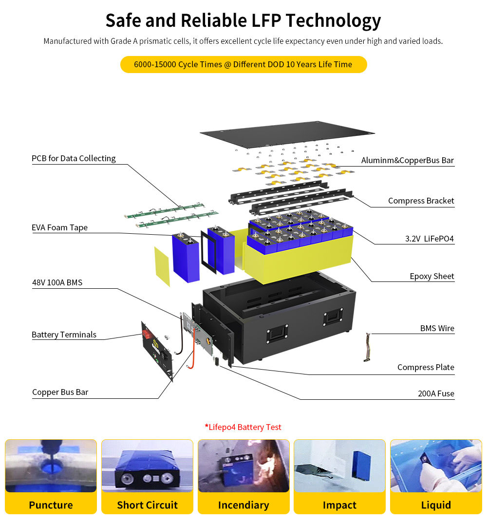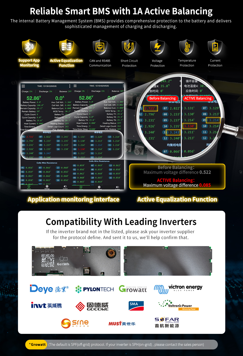 - Sisäänrakennettu 16S 100A älykäs invertteri-BMS latauksen ja purun hallintaan ja suojaamiseen