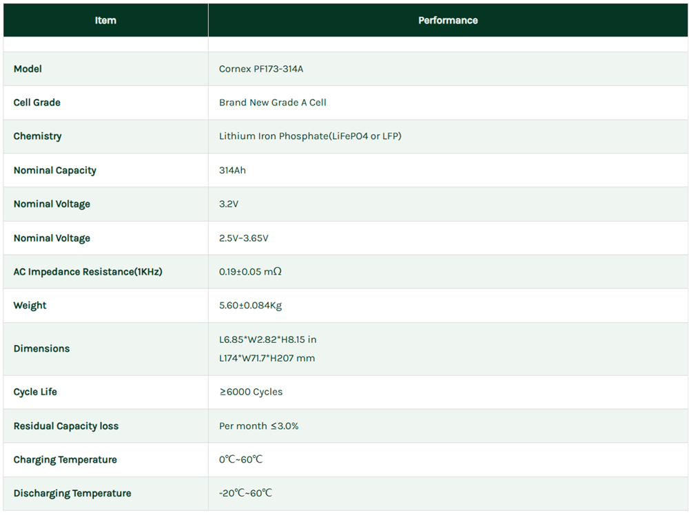 Gokwh Cornex PFI173-314A on 3.2V LiFePO4 -kenno, jonka kapasiteetti on 314Ah. Se on suunniteltu energian varastointiin ja sovelluksiin, joissa vaaditaan pitkä käyttöikä, tasainen purkualusta ja korkea turvallisuustaso.