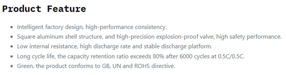 - Neliömäinen alumiinikuori ja tarkka räjähdyssuojausventtiili, korkea turvallisuustaso.