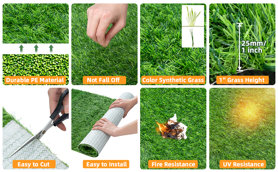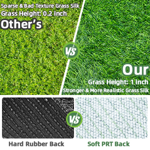 Tiheä 2-sävyinen kuitu ja 1 tuuman(25 mm)nukkakorkeus tuovat luonnollisen ilmeen ja miellyttävän tuntuman ympärivuotiseen käyttöön. PE-materiaali on pehmeä ja joustava, eikä kuitu irtoa helposti. Paksunnettu PRT-tausta on kestävä ja hyvin vettä läpäisevä, mikä nopeuttaa lian ja veden poistumista verrattuna kumitaustaan.