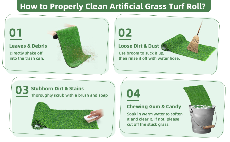 Ennen käyttöä aseta matto aurinkoon 3 päiväksi tai harjaa kuituja vastakarvaan, jotta kuljetuksessa painunut nurmi nousee pystyyn. Käytön myötä joustavuus palautuu ja nurmi näyttää korkeammalta. Tarjoamme 100% tyytyväisyysratkaisun mahdollisiin ongelmiin.