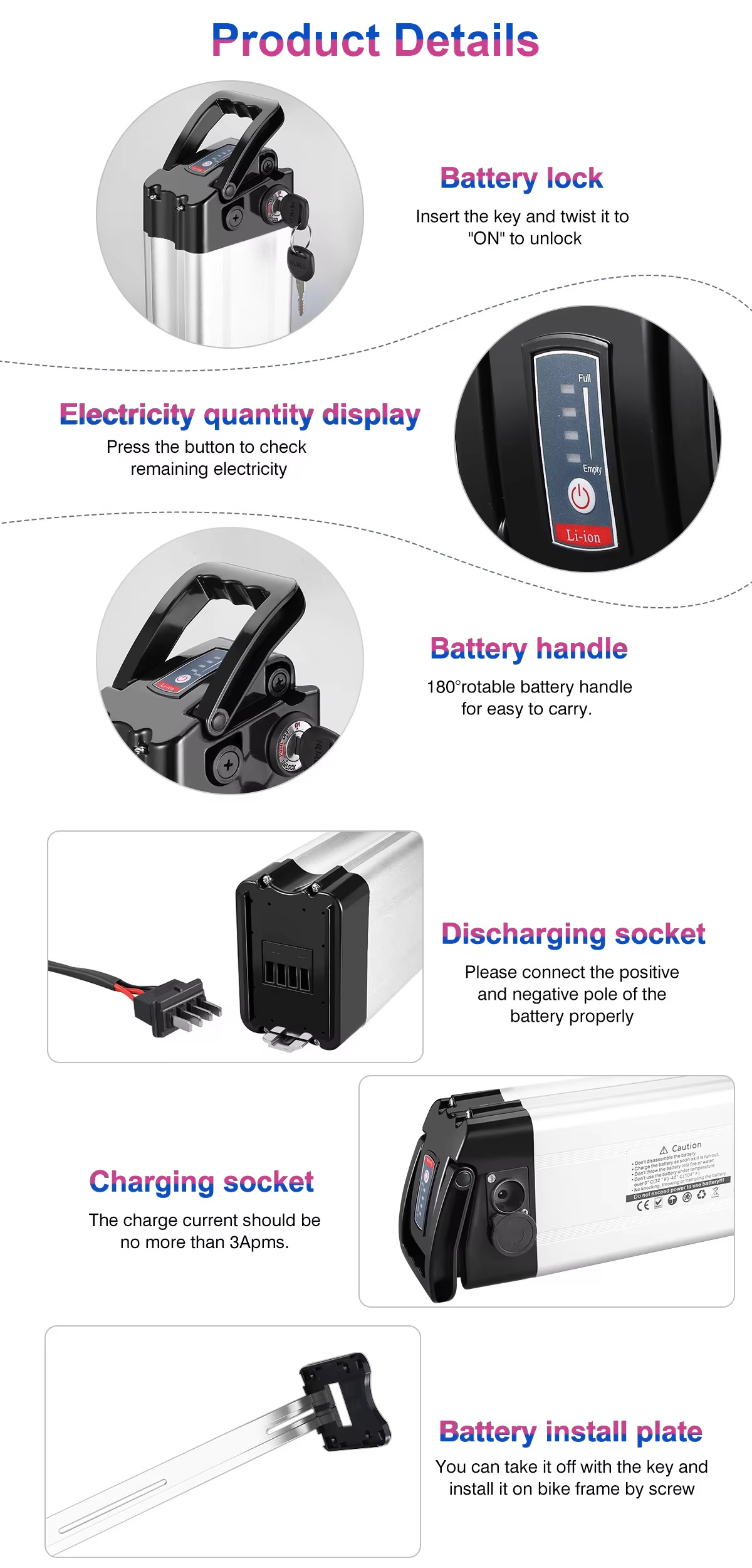 Helppo asennus: Kevyen ja pienen koon ansiosta litiumioniakku on helppo asentaa ja irrottaa. Sopii 600W sähköpyöriin.