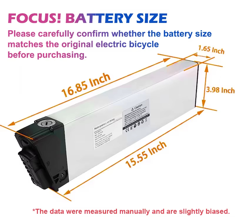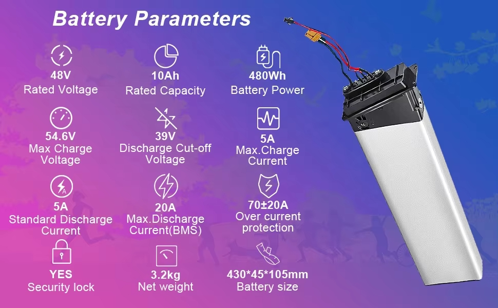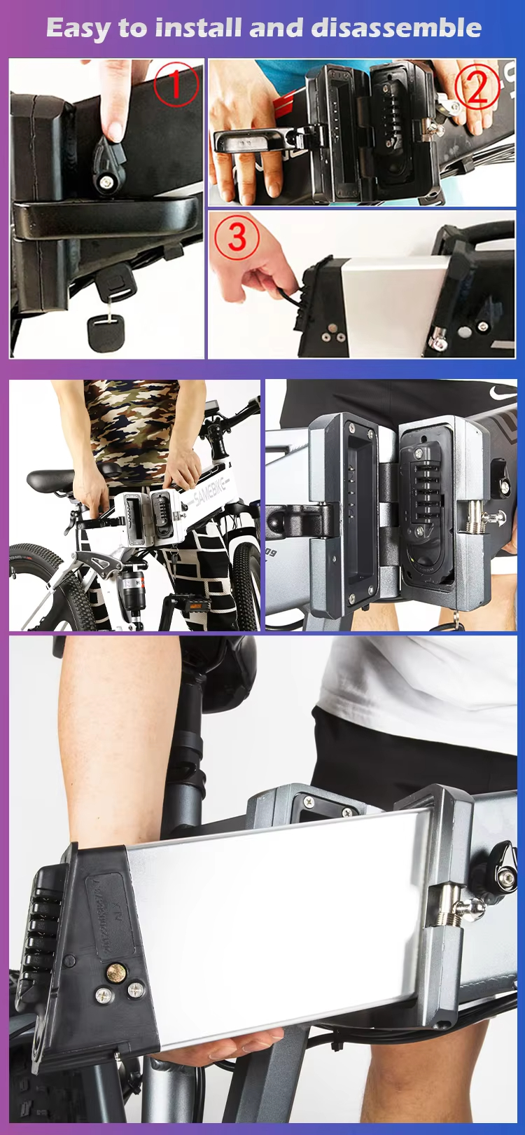 Akkupaketti toimitetaan kiinnitystelineen kanssa, joka sopii useimpiin runkoihin, joissa on juomapullotelineen kiinnitysreijät. Yhteensopiva 48V sähköpyörien, kaupunkipyörien ja maastopyörien kanssa.