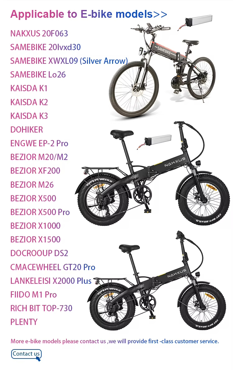 Tämä 48V sähköpyörän akku on yhteensopiva seuraavien sähköpyörämallien kanssa: For NAKXUS 20F063 / SAMEBIKE 20lvxd30 Lo26 / KAISDA K1 K2 K3 / PLENTY / DOHIKER / ENGWE EP-2 Pro / BEZIOR M20 M2 XF200 / RICH BIT TOP-730 / BEZIOR X500 Pro X1000 / DOCROOUP DS2 / LANKELEISI X2000 Plus / BEZIOR X500 X1500 / FIIDO M1 Pro / LAOTIE PX5 Engwe EP/2 Samebike PLENTY.
