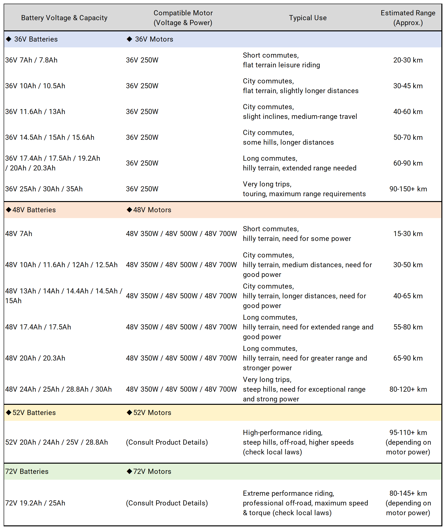 Katso alla olevasta taulukosta, miten valitset sähköpyörääsi sopivan akun ja moottorin.