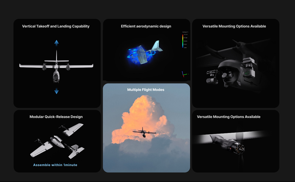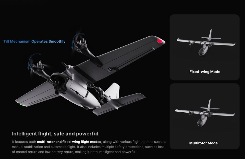 - Useita lentotiloja: kiinteäsiipi- ja moniroottoritilat erilaisiin tehtäviin