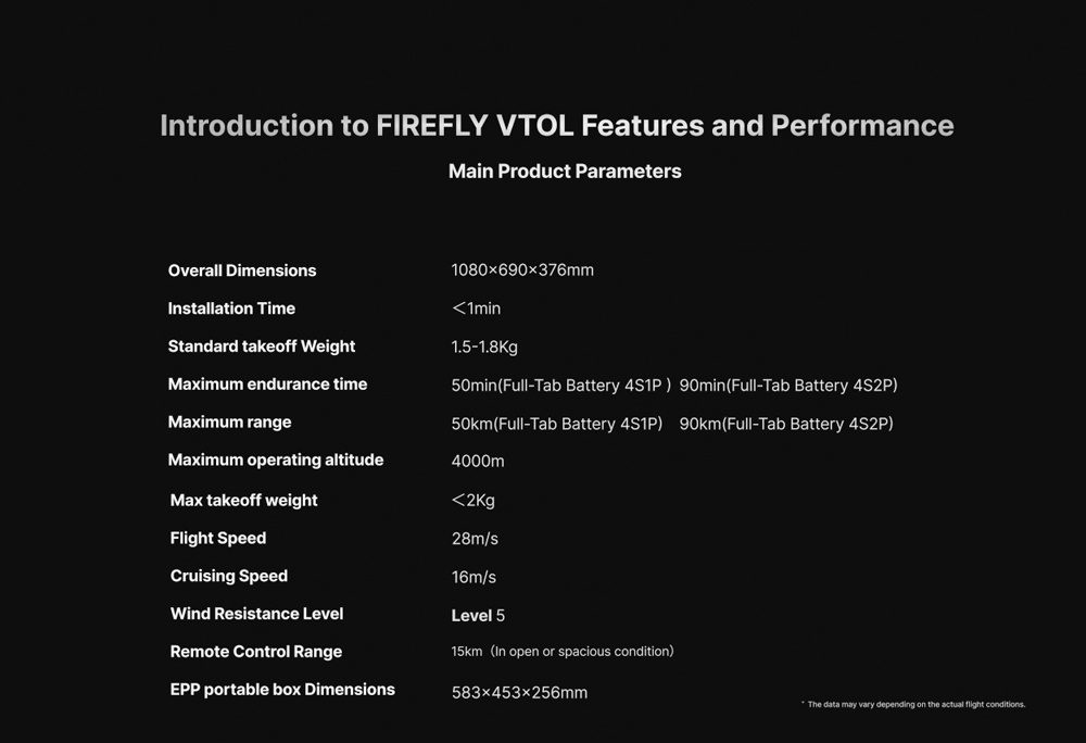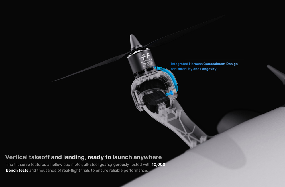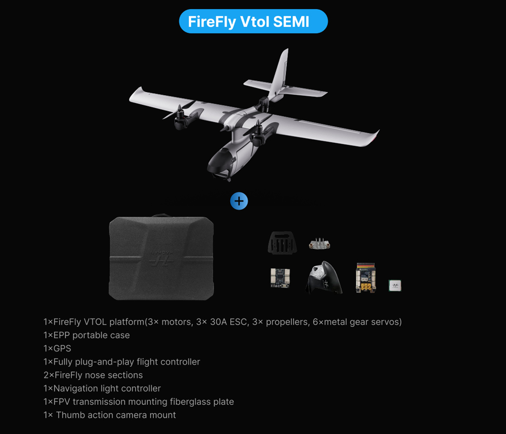 HaoHan FireF1y VTOL on pystysuoraan nousuun ja laskuun kykenevä kiinteäsiipinen FPV-UAV, joka yhdistää moniroottorin hallittavuuden ja kiinteäsiipisen tehokkaan risteilyn. Modulaarinen, nopeasti irrotettava rakenne mahdollistaa käyttöönoton alle 1 minuutissa, ja tukeva rakenne sekä tuulenkesto tekevät siitä sopivan monenlaiseen valvonta-, tarkastus- ja kuvantamiskäyttöön.
