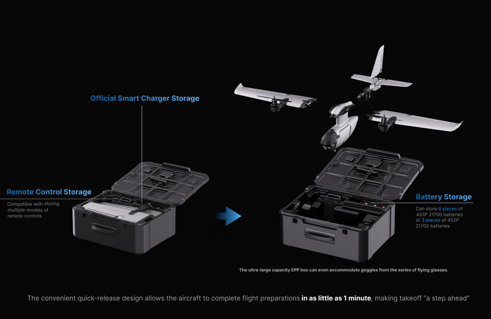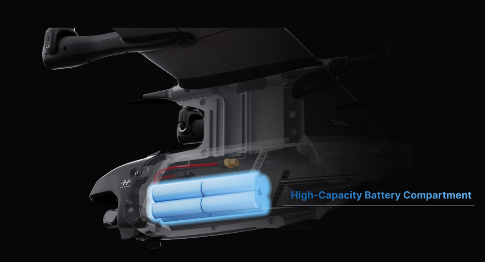 - Pitkä toiminta-aika ja kantama, enintään 90min lento ja 90km kantama Full-Tab-akulla 4S2P