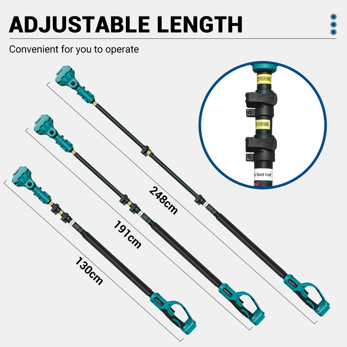 Teleskooppinen jatkovarsi mahdollistaa korkealla olevien oksien leikkaamisen maasta käsin. Mukana tulevat olkaremmit parantavat mukavuutta ja tukevat työskentelyä pidempäänkin.