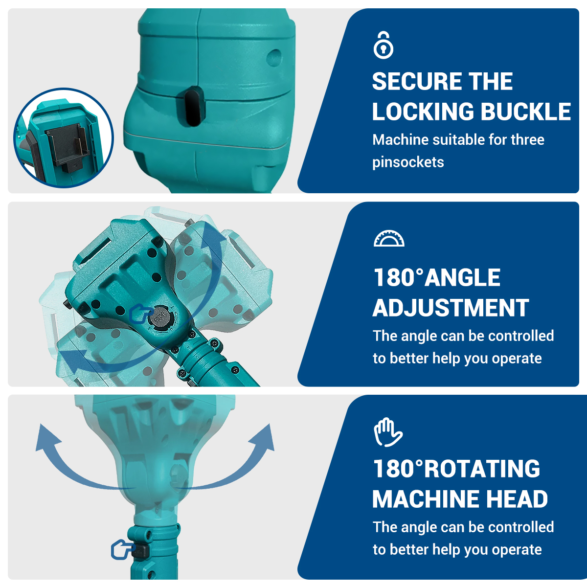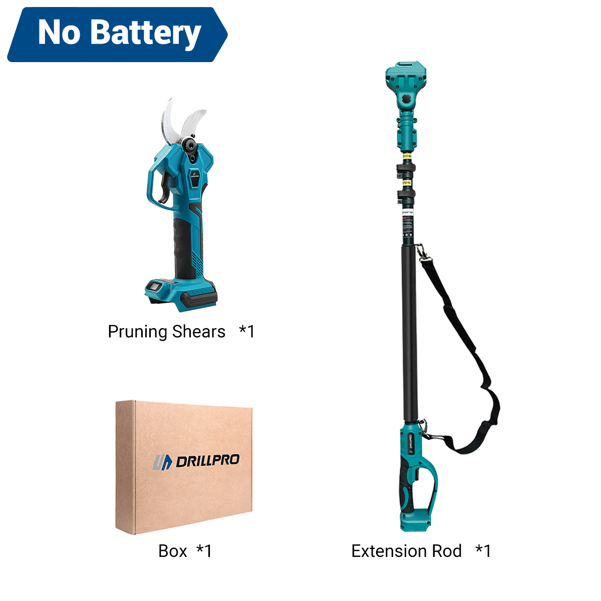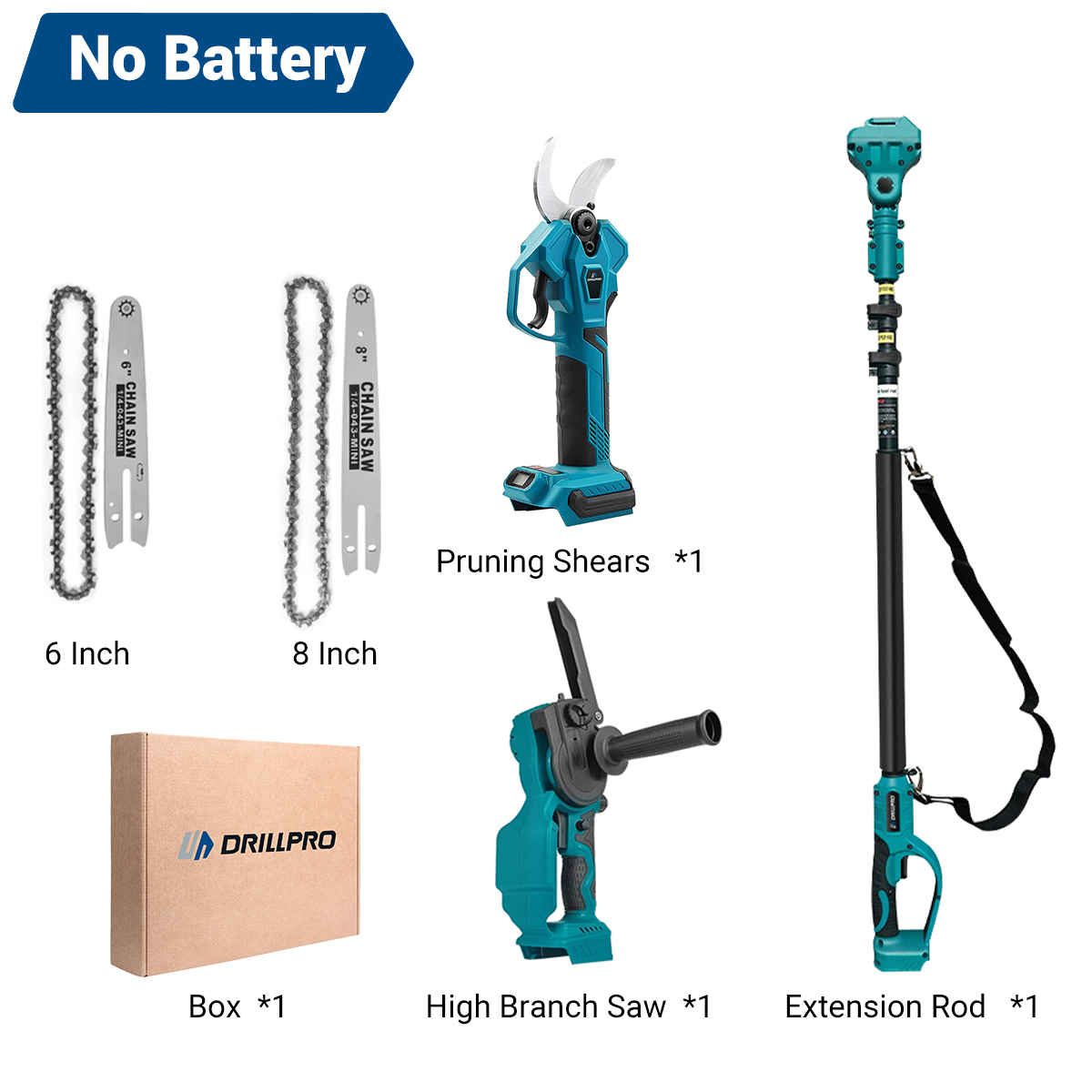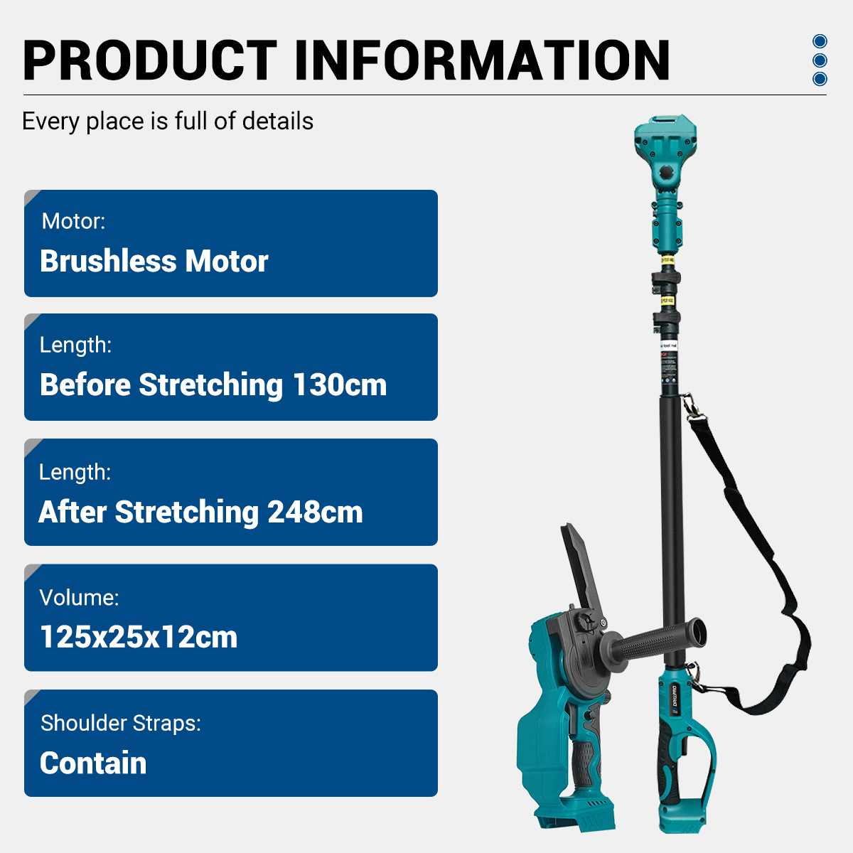 Harjaton kaksitoiminen sähkötyökalu: sähkösakset, ketjusaha, teleskooppivarsi ja akunäyttö