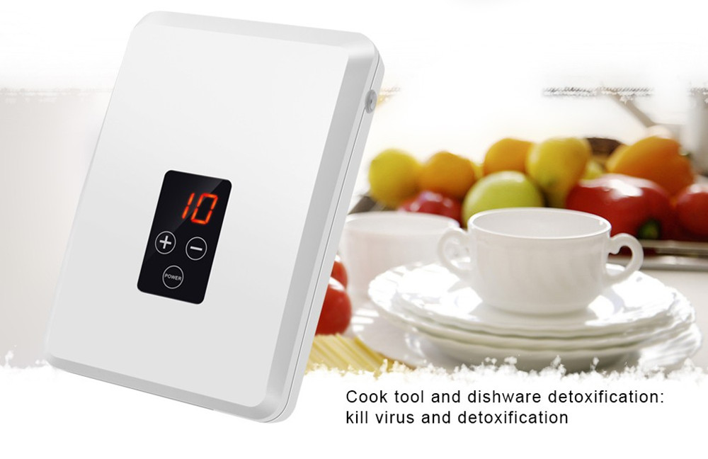 Monikäyttöinen otsonigeneraattori hedelmien ja vihannesten desinfiointiin sekä ilman hajujen poistoon. Kevyt laite voidaan ripustaa seinälle tai käyttää siirrettävänä.