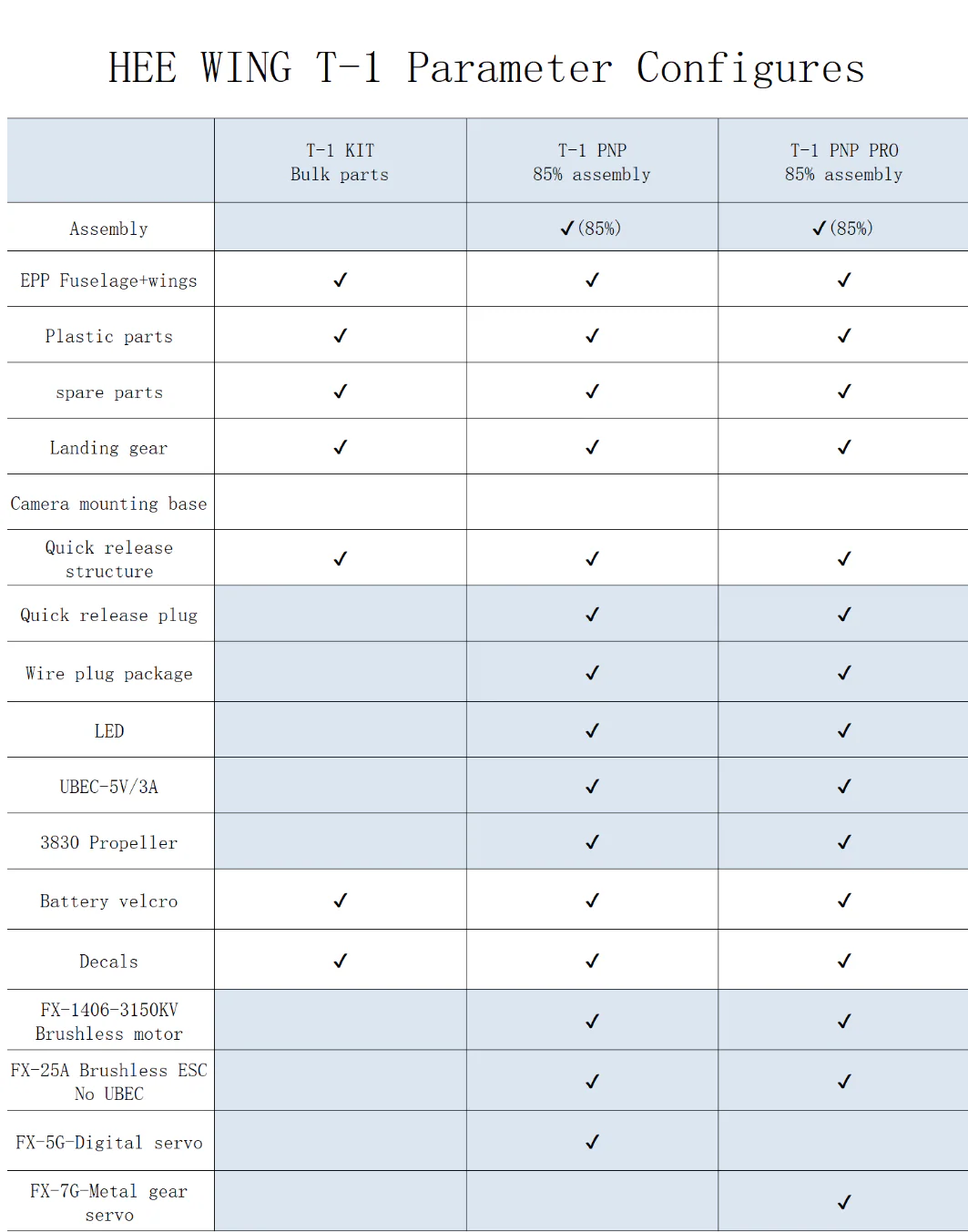 - PNP Pro -versiossa on uudemmat ja tehokkaammat 1406-moottorit 1404-moottorien sijaan, 25A ESC 20A ESC:n sijaan, 7g digitaaliset metallirattaservot 5g digitaalisten muovirattaservojen sijaan sekä RGB-navigointivalot ja ohjainkortti.
