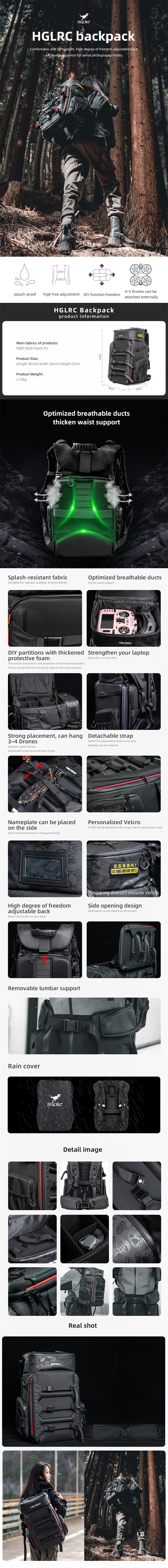 HGLRC Backpack on keskikokoinen reppu, joka on suunniteltu erityisesti FPV-droneharrastajille ja valokuvauksen ystäville.