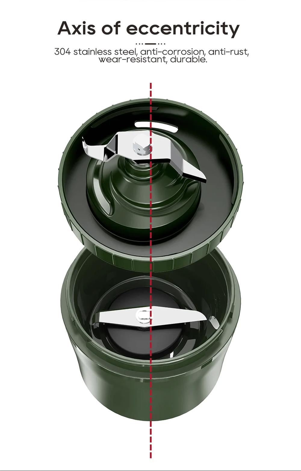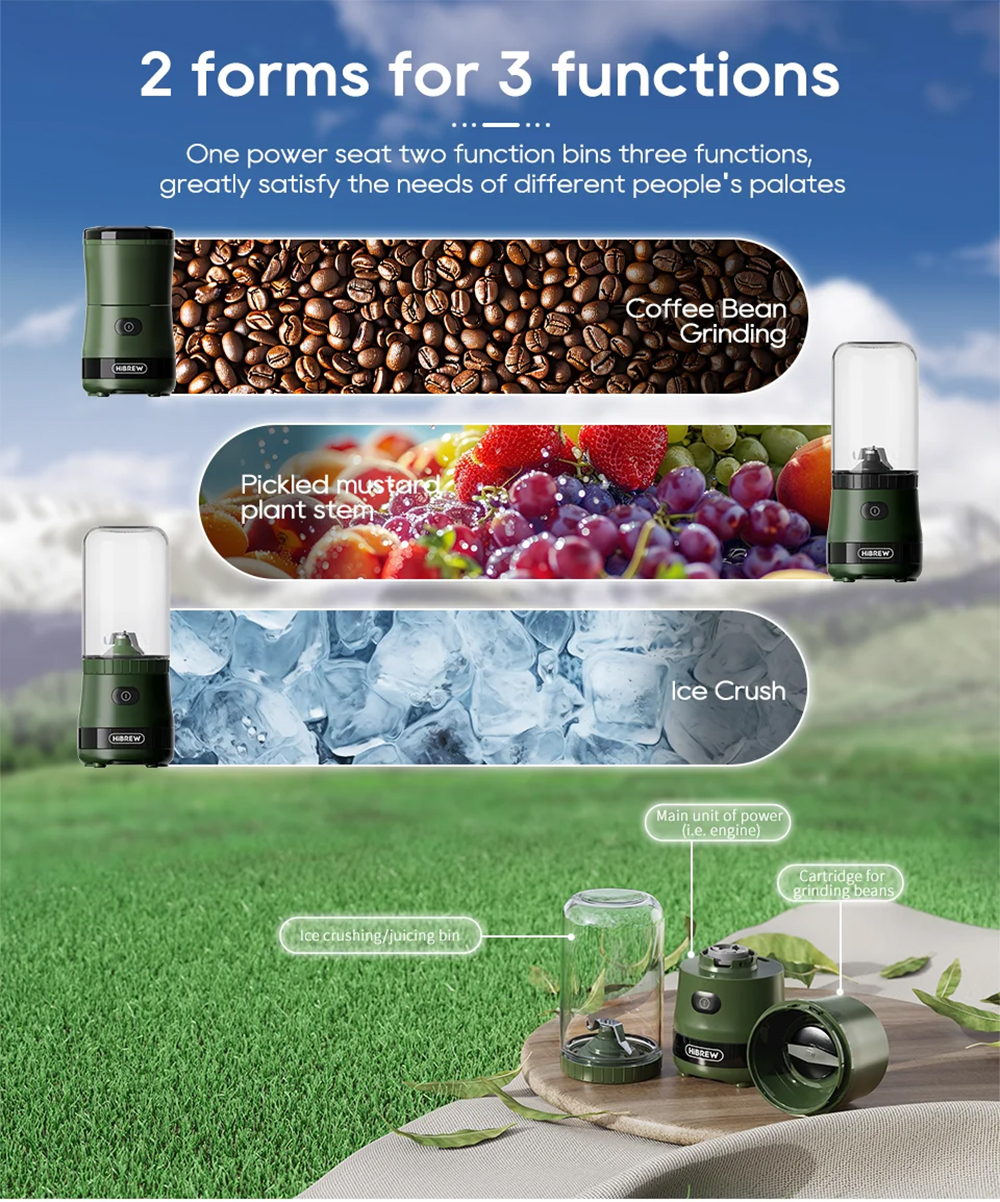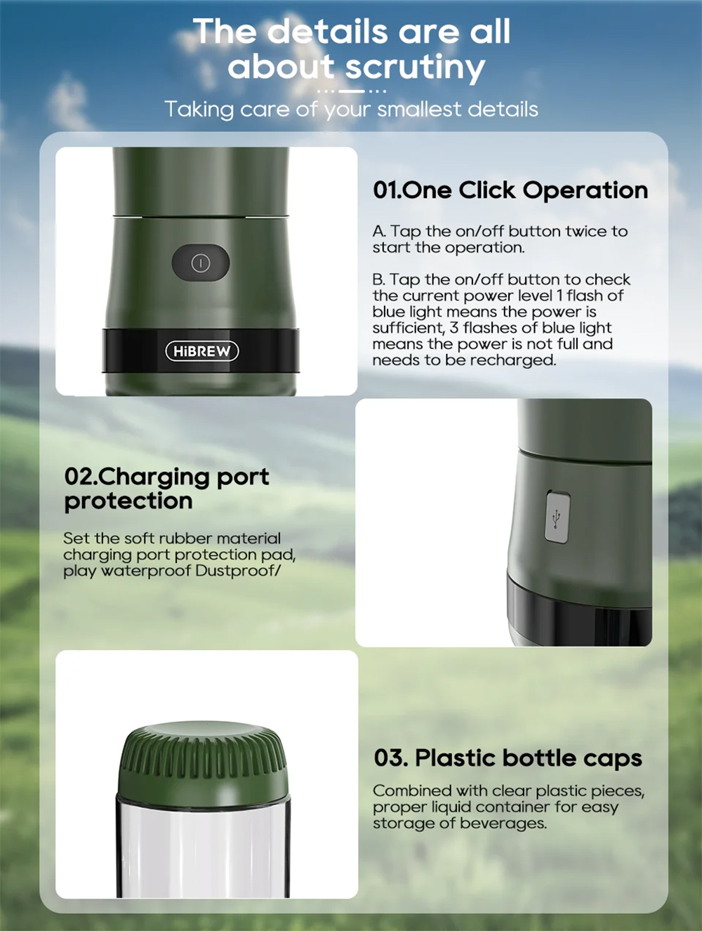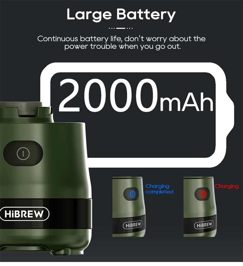 HiBREW G2 yhdistää kahvimyllyn, mehunpuristimen ja jäämurskaimen kompaktiin, helposti mukana kulkevaan runkoon. 304-ruostumattoman teräksen terät ovat kulutusta, korroosiota ja ruostetta vastaan, mikä takaa tasaisen jauhatuksen ja tehokkaan jäänmurskauksen. 70W moottori ja korkea vääntö tuottavat vakaan suorituskyvyn jopa 18,000 kierrosta/min -nopeudella. 2000mAh akku mahdollistaa pitkäkestoisen käytön, ja USB-lataus tuo joustavuutta arkeen. Turvatoiminnot ehkäisevät virhekäyttöä, ja yhden painalluksen ohjaus tekee käytöstä suoraviivaista. Latausportin suojatyyny auttaa pitämään liitännän pöly- ja vesisuojattuna.