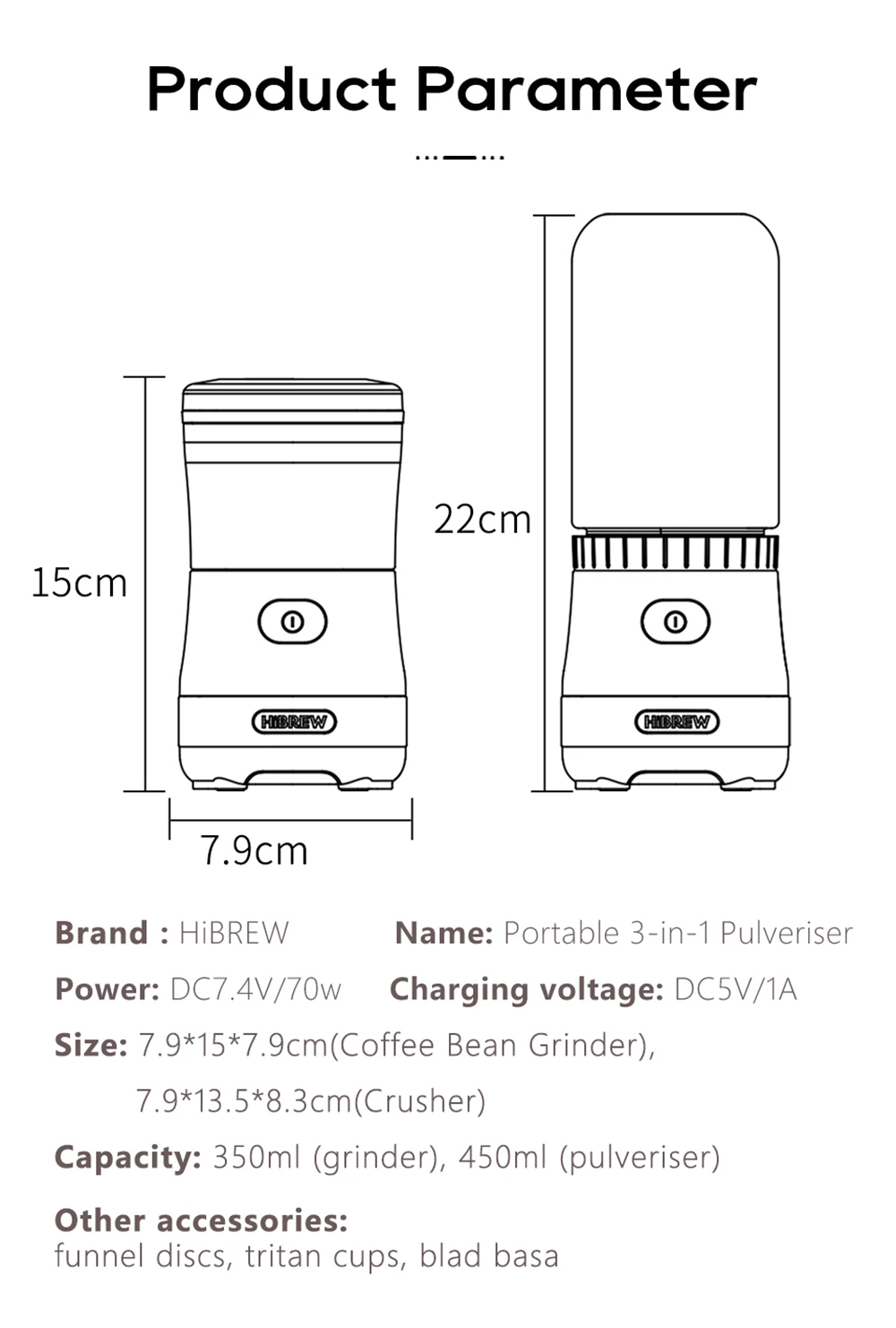 Tuotemerkki: HiBREW Malli: G2 Teho: tasavirta 7.4V / 70W Latausjännite: tasavirta 5V / 1A Mitat: kahvimylly: 7.9*15*7.9cm murskain: 7.9*13.5*8.3cm Tilavuus: mylly: 350ml / murskain: 450ml |