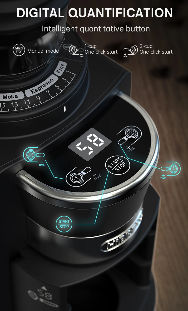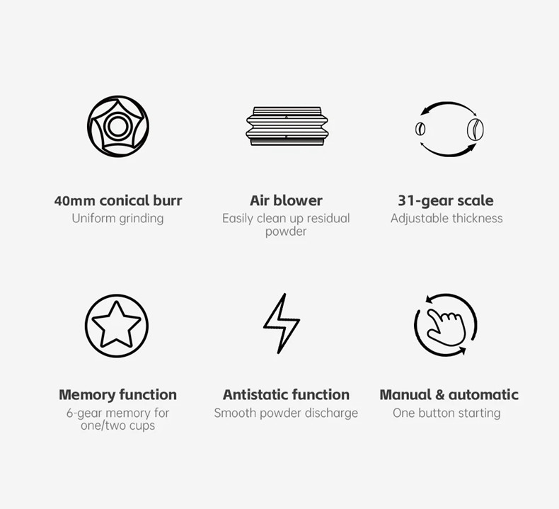 - Tukeva kartioterä – 40mm tarkkuushiotut ruostumattomasta teräksestä valmistetut kartioterät vähentävät jauhatuksen lämpenemistä ja suojaavat kahvipapujen aromaattisia öljyjä. Tasainen jauhatus takaa puhtaan maun ja tasapainoisen uuton.