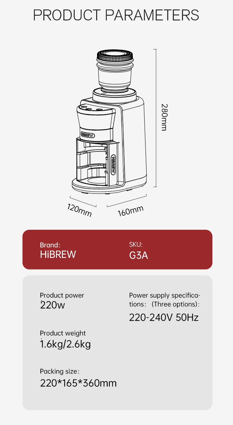 Brändi: HiBREW Malli: G3A Väri: beige / musta Teho: 220W Virtalähde: 220~240V 50Hz Papusäiliö: 210g |
