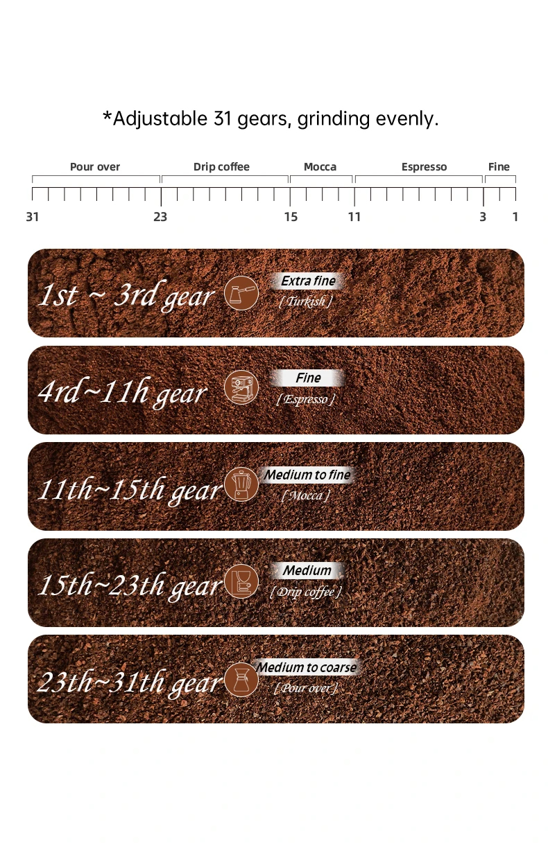 - 31-portainen jauhatussäätö – hienosta espressojauhatuksesta karkeaan pressopannuun: valitse sopiva karkeus 31 portaan avulla.